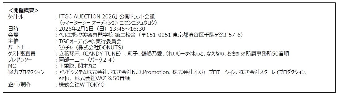 東京ガールズコレクションを企画・制作する株式会社W TOKYO(本社:東京都渋谷区/代表取締役:村上範義)は、史上最大級のファッションフェスタ「東京ガールズコレクション(以下、TGC)」がプロデュースする、日本最大級のガールズオーディションプロジェクト「TGC AUDITION 2026」の選択指名制度を導入した、公開ドラフト会議を2026年2月1日(日)、ベルエポック美容専門学校 第二校舎で開催しました。