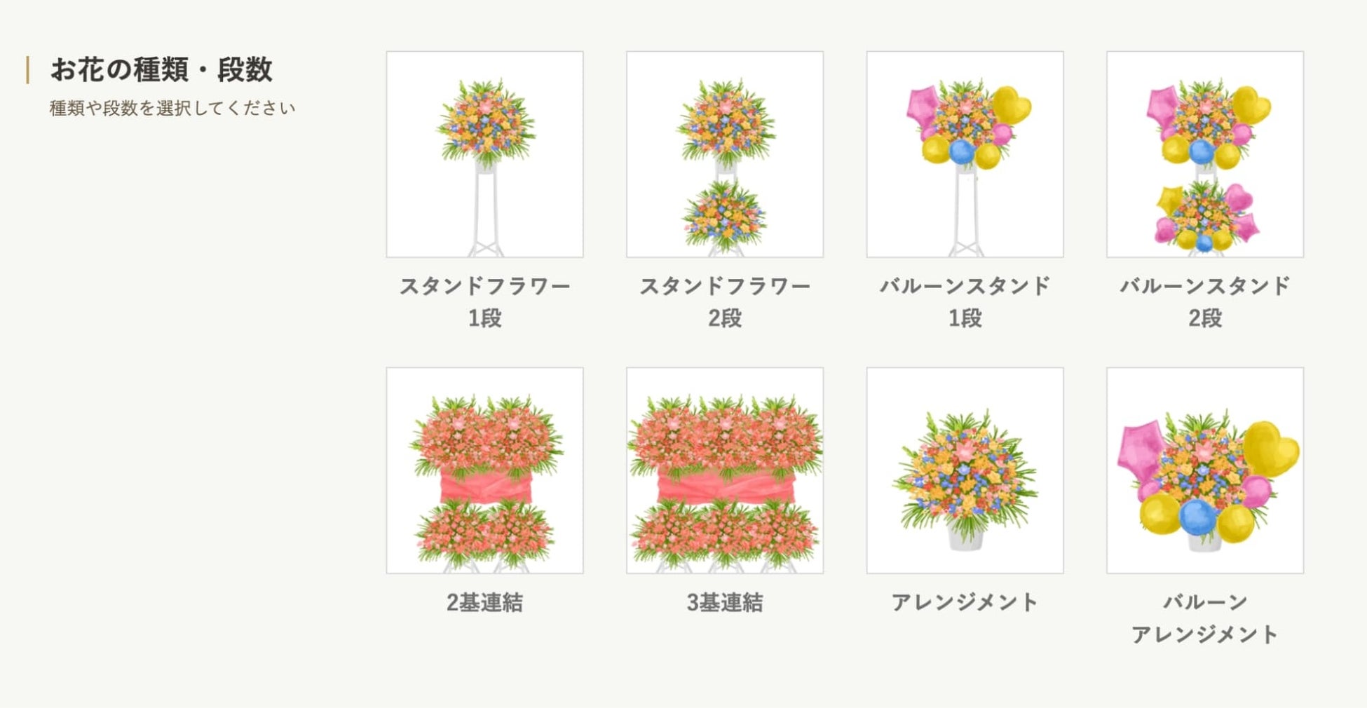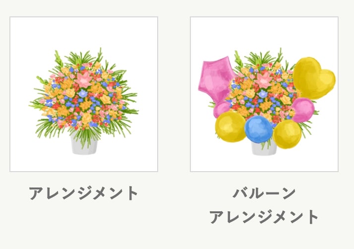 お客様からの熱いご要望にお応えし、新たに「アレンジメント」「バルーンアレンジメント」のカスタムを追加。さらに、カラーバリエーションも拡充し、アレンジメントではラッピング選択も可能となりました。