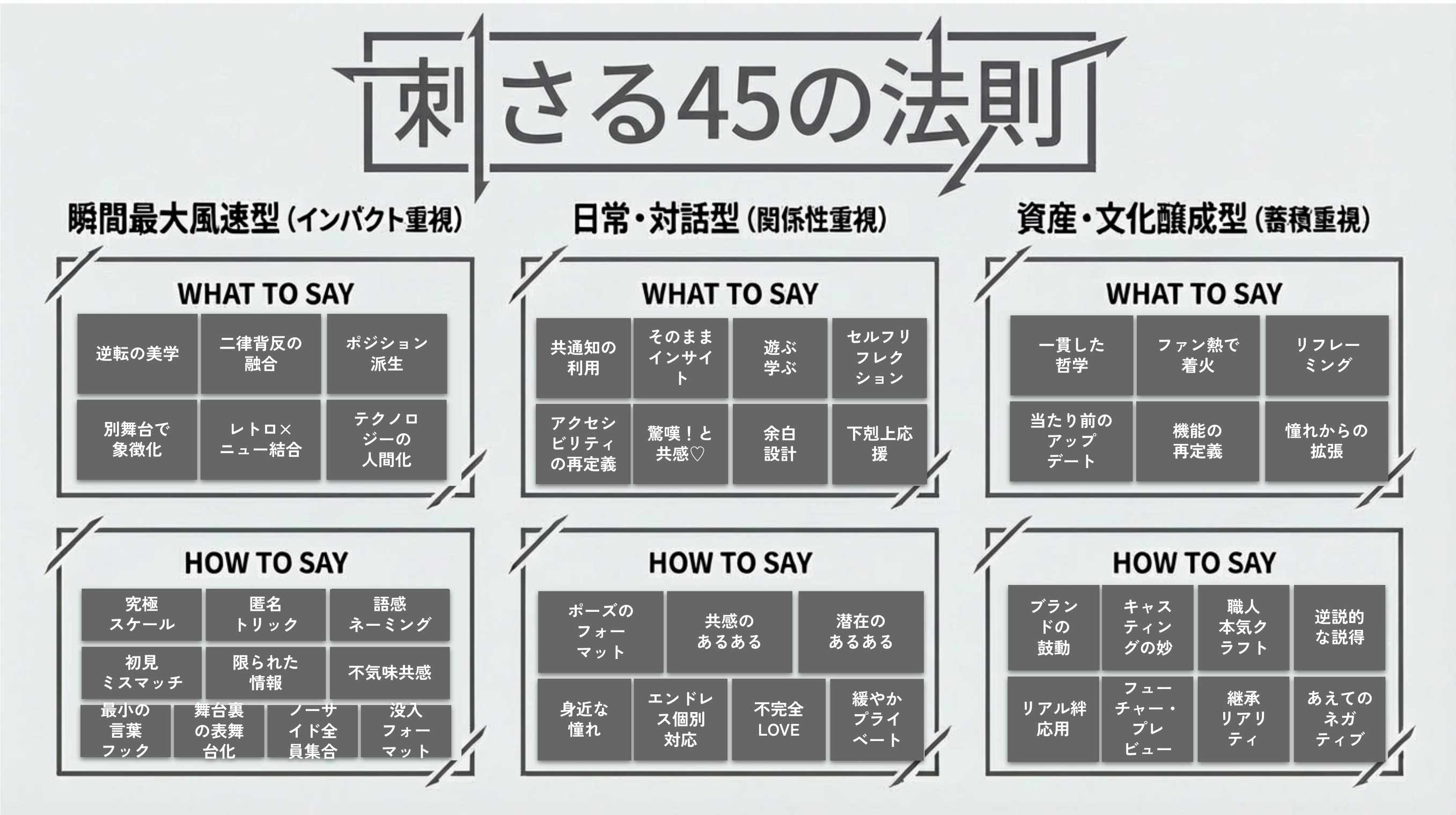 「刺さる45の法則」は、解決したい課題の性質や見据える時間軸に合わせて適応できるよう【瞬間最大風速型】【日常・対話型】【資産・文化情勢型】の3パターンで構成。さらにその上で、思考の型を示す【What to Say】と表現の型を示す【How to Say】に分類することで、ターゲットインサイトに基づき、時代のニーズに合わせた刺さるコミュニケーションを可能にします。それぞれの詳細な説明や具体例については、ぜひお問い合わせください。