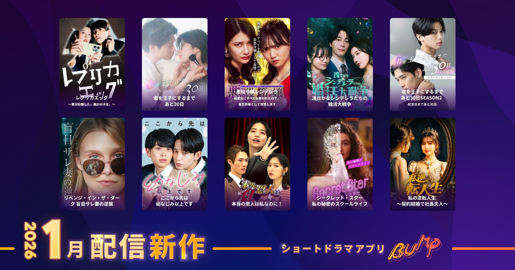 ショートドラマアプリ「BUMP」の開発・提供を行うemole株式会社(本社:東京都目黒区、代表取締役:澤村直道、以下、emole)は、「BUMP」にて、2026年1月、新作のショートドラマ作品10本、『レプリカエッグ〜妻が妊娠した、誰かの子を。〜』『君を王子にするまであと30日』『悪役令嬢シンデレラ 極悪女にすべてを奪われたので、最恐令嬢として復讐します』『浅はかなシンデレラたちの婚活大戦争』『君を王子にするまであと30日SEASON2 -記念日まであと30日-』『リベンジ・イン・ザ・ダーク 盲目サレ妻の逆襲(原題:Now You See Him – Revenge of a Blind Wife –)』『ここから先は幼なじみ以上です』『本当の恩人は私なのに!』『シークレット・スター 私の秘密のスクールライフ(原題:The Hidden Life of a Secret Pop Star)』『私の逆転人生 〜契約結婚で社長夫人〜』を配信開始いたしました。