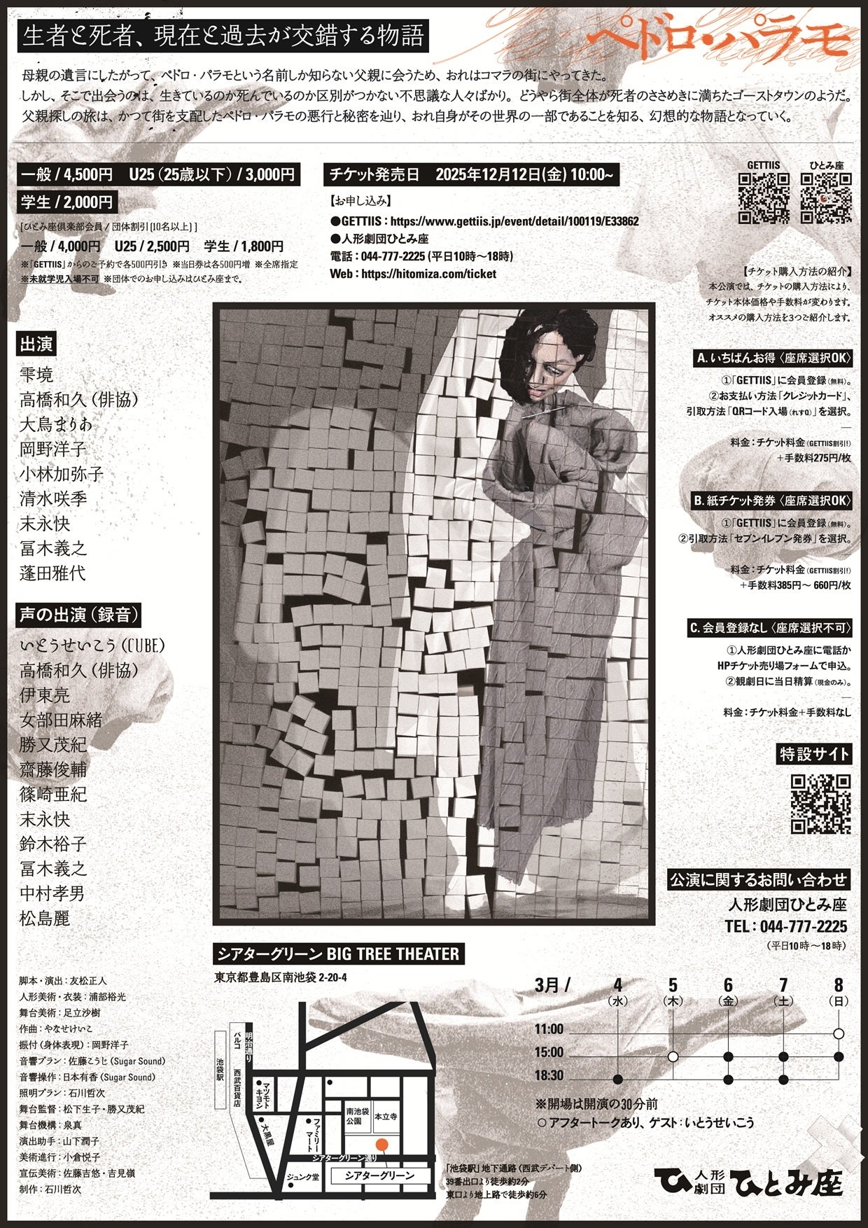 人形劇団ひとみ座 人形劇「ペドロ・パラモ」が2026年3月4日 (水) 〜 3月8日 (日)にシアターグリーン BIG TREE THEATER(東京都豊島区南池袋2-20-4)にて上演されます。