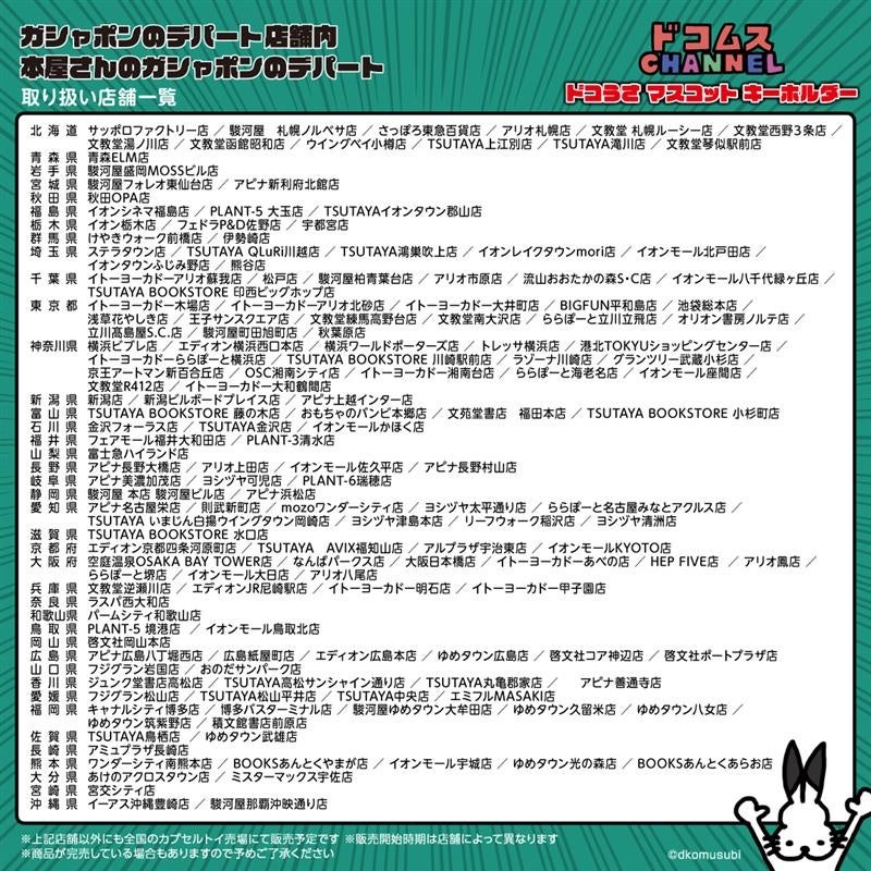 ファッション・アパレル雑貨を中心に企画・製造・販売など、国内外のブランドのOEM事業を手がけるイエロー株式会社(本社:東京都渋谷区 代表取締役:阪崎英一郎、以下「当社」)は、カプセルトイ『ドコムス ドコうさマスコットキーホルダー』を2026年2月上旬より、店頭販売することを告知いたします。