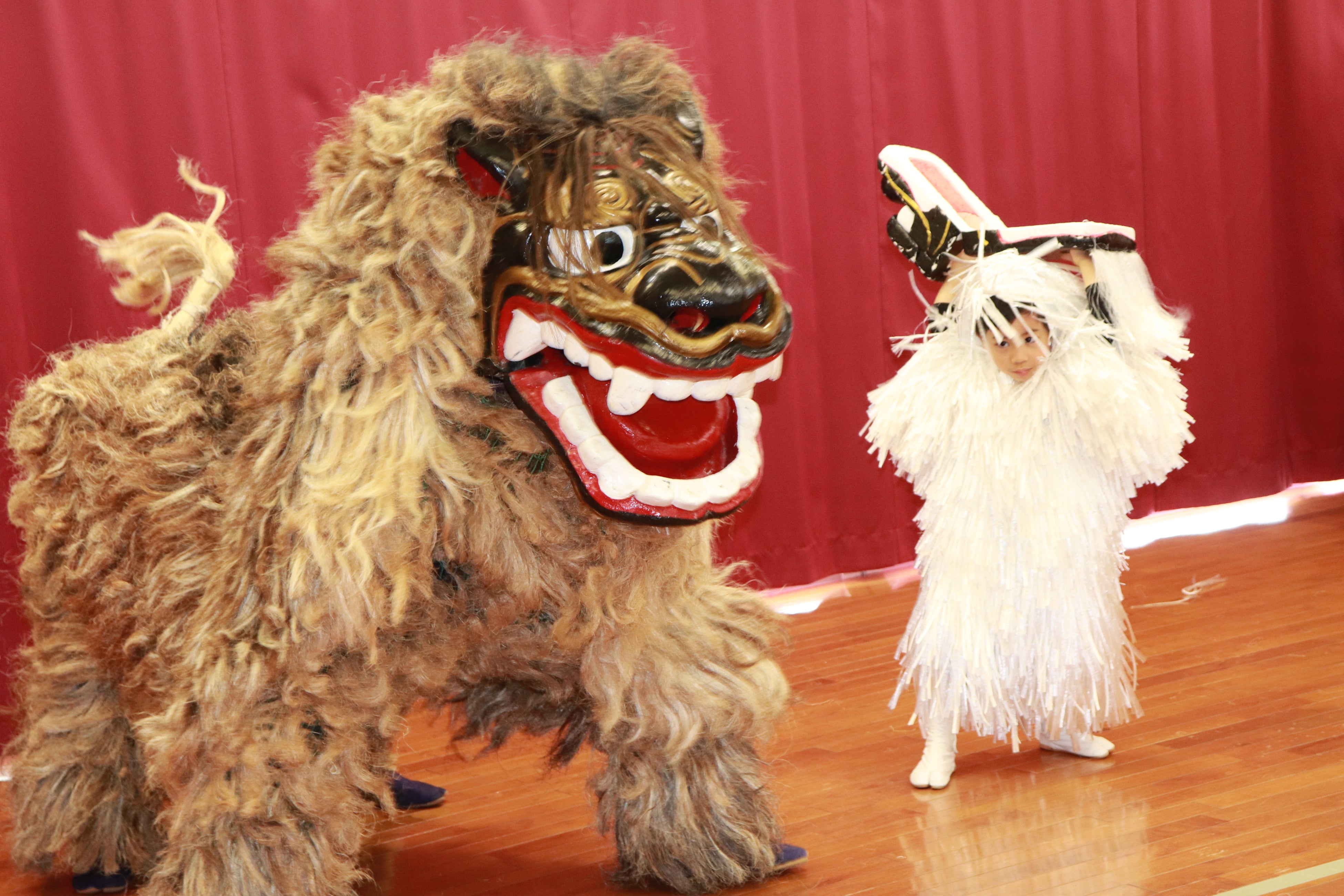 1月30日(金)午前、なのはな保育園の園児たちが集まる会場に、指笛の音とともに獅子舞が登場。獅子の中から小さな獅子のあいとくんが登場すると、会場からは驚きの声と大歓声が上がりました。憧れの「創作芸団レキオス」のメンバーとともに、勇壮な獅子の動きを見事に表現しました。