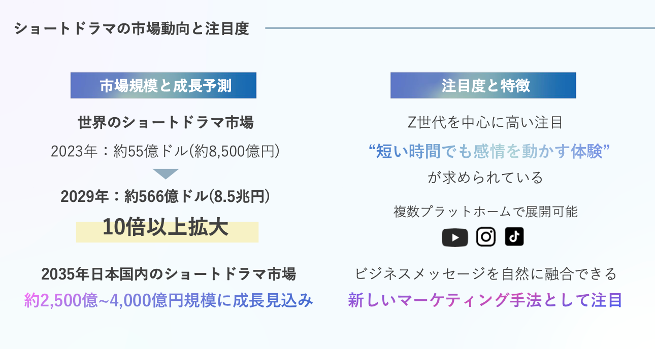 近年、 スマートフォンでの動画視聴が一般化し、 短時間で高い満足度を得られる「ショ ートドラマ」 市場が急拡大しています。 市場調査によると、 2023年に約55億ドル(約8,500億円)  だった市場規模は、2029年には約566億ドル(約8.5兆円)  へと10倍以上に成長すると予測されています。