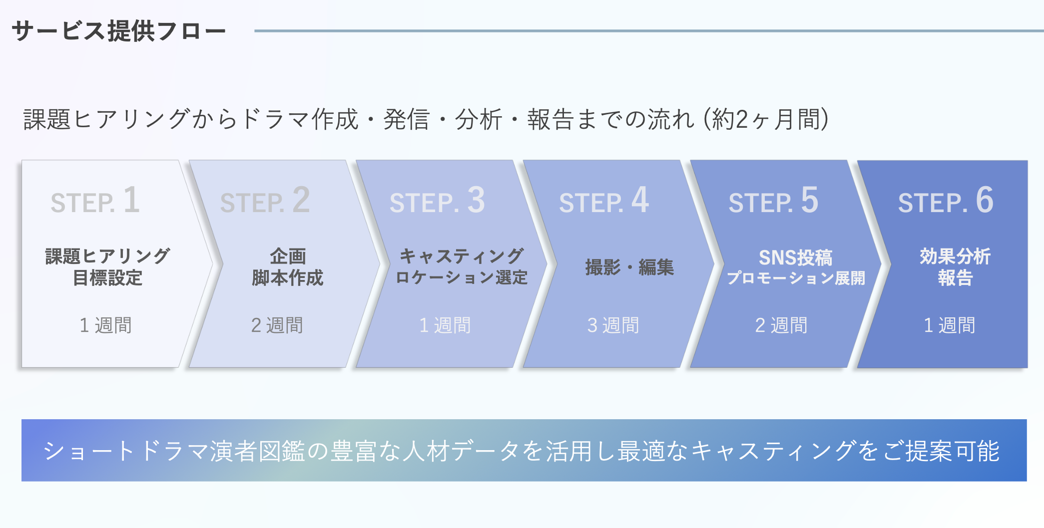 当社は単なる制作会社に留まらず、「ファンを抱えた表現者」を熟知するインフルエンサーキャスティングのプロフェッショナルとして、企業のブランドストーリーを熱狂的に、かつ瞬時に波及させる**「次世代の番組制作局」**としての役割を担います。自社運営のクリエイタープラットフォーム「ショートドラマ演者図鑑」に所属する、総フォロワー数500万人を超えるクリエイター陣を起用。2029年に世界規模で約8.5兆円への成長が予測されるショートドラマ市場において、物語の力で企業のブランディングを加速させます。