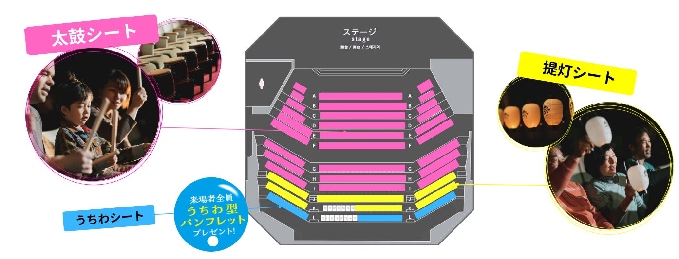 太鼓シート・提灯シート・うちわシートの3種類の席種によって、異なる体験を楽しめます。会場が一体となって祭シアターにしかない面白さと感動を味わうことができます。