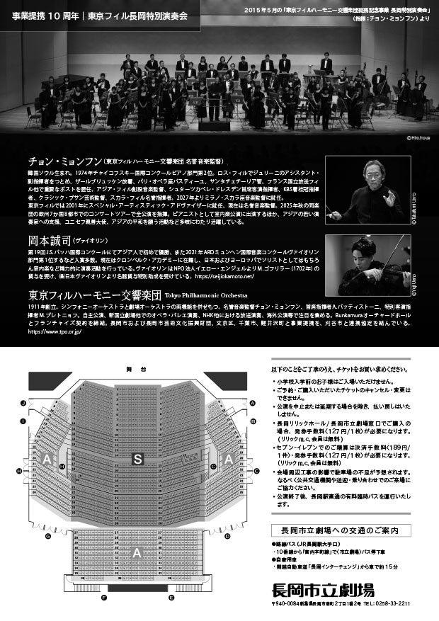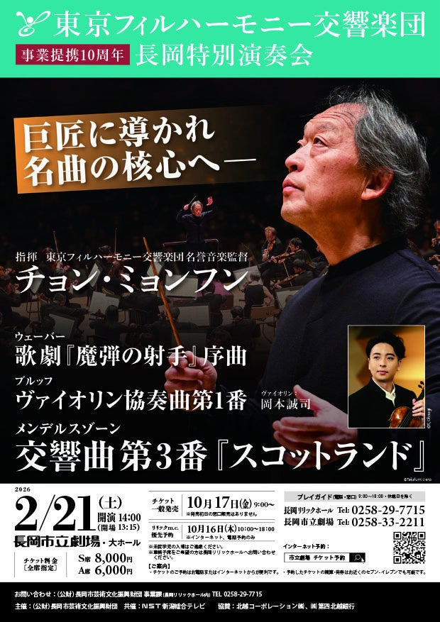 事業提携10周年となる今年度はこれを記念して、公益財団法人長岡市芸術文化振興財団の主催により、2月21日(土)長岡市立劇場にて、東京フィルの名誉音楽監督で25年にわたる信頼関係を築いてきた韓国出身の世界的指揮者チョン・ミョンフン氏とともに特別演奏会を開催いたします。