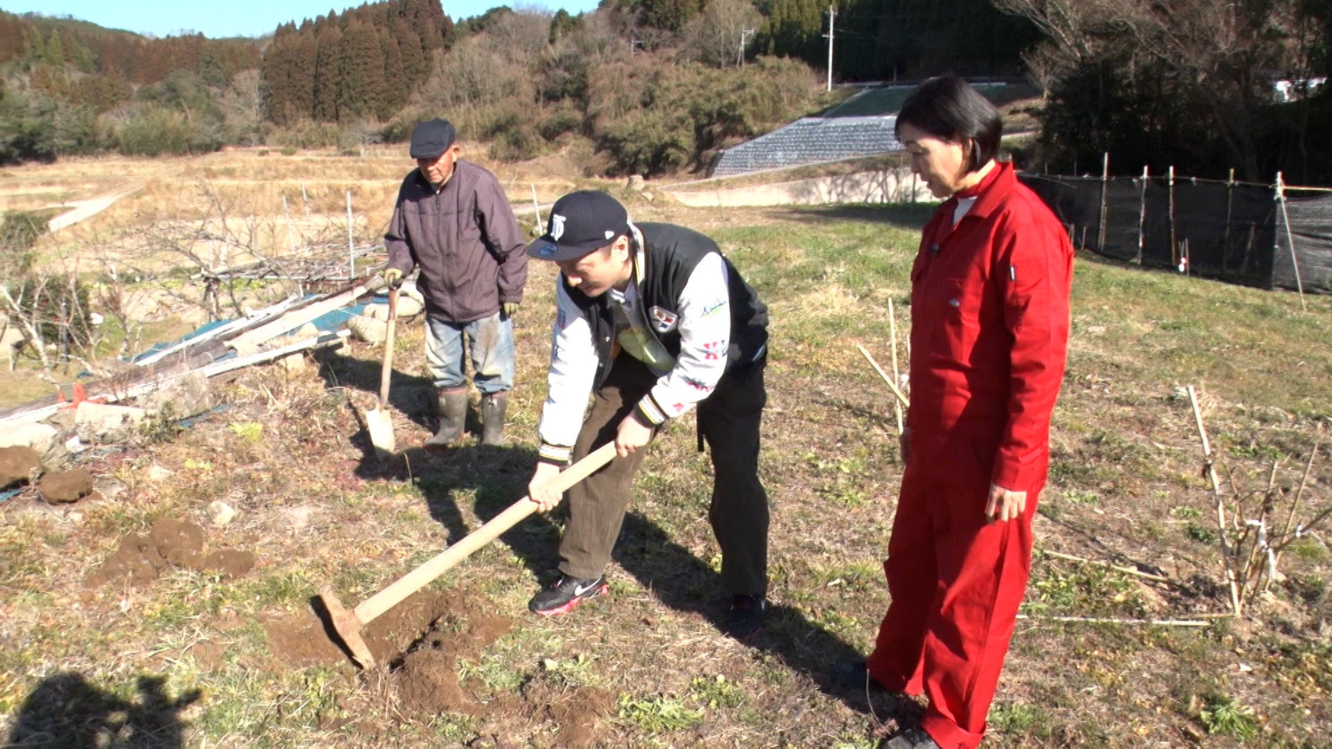 続いてはザクロの苗木を植樹します。実はこのザクロ、スタッフからなおみさんへ還暦祝いとして贈られた記念すべき苗木なのです。さて、まずは畑を耕します。が、これが想像以上に重労働で…。