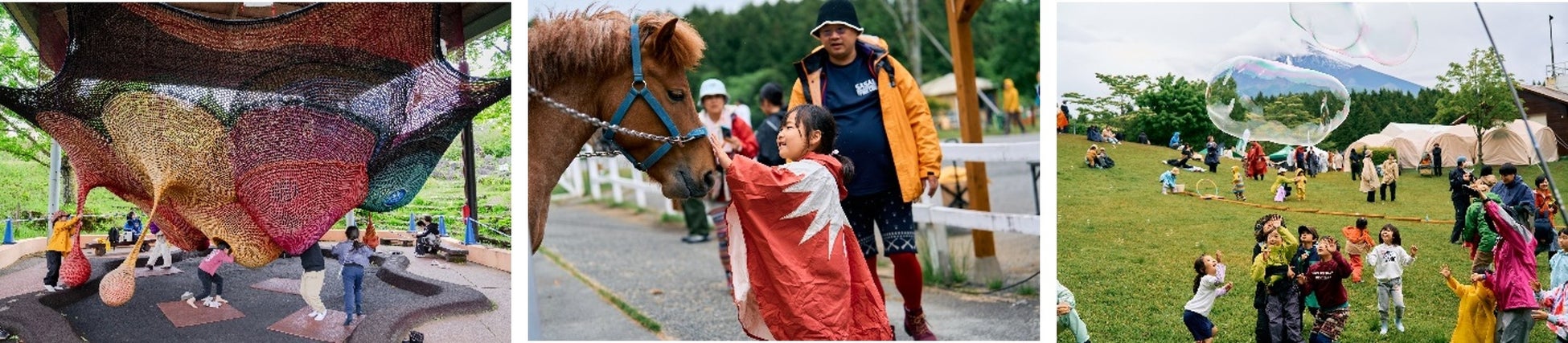 FUJI & SUNは今年も小学生以下の入場が無料!会場である「富士山こどもの国」には、富士山から流れ出た溶岩でできた遊び場やすべり台、巨大なハンモック遊具の“くもの巣ネット”や遺跡を模した迷路など、天然の地形を活かしたアスレチックが盛りだくさん!アルパカやポニーなど、さまざまな動物たちとふれあったり、えさやりも体験できます。赤ちゃんから小学生までが安心して楽しめるキッズエリアも登場し、ピタゴラ玉転がしやシャボン玉など遊びながら学べるコンテンツを通じて、家族の絆を深める時間をお届け!自然豊かな会場を余すところなく駆けめぐり、非日常の冒険をお楽しみください。