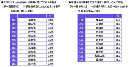 【調査結果(抜粋)】 ◆カーライフに関するコストの実感 ・カーライフに関するコストの実感 「車の維持費は家計を圧迫していると感じる」全体の37.9% 1位 秋田県、2位 鳥取県、3位 宮城県 「自動車関連の税金に不満がある」全体の48.1% 1位 栃木県、2位 群馬県・愛知県・兵庫県   ◆カーライフにおける節約意識 ・ 都道府県別カーライフ節約意識度 自己評価は100点満点中で何点? 「自動車購入費の節約」は平均51.0点、都道府県別では1位 沖縄県 58.7点 「ガソリン代の節約」は平均55.0点、都道府県別では1位 山形県 62.0点 「ドライブ費用の節約」は平均50.4点、都道府県別では1位 山形県・沖縄県 54.7点 「車検・メンテナンス費用の節約」は平均50.0点、都道府県別では1位 沖縄県 55.0点 「自動車保険料の節約」は平均48.4点、都道府県別では1位 岩手県 55.5点   ◆カーライフにおける節約行動 ・ 都道府県別のカーライフにおける節約術の実践率 「自動車購入費の節約」「ドライブ費用の節約」「車検・メンテナンス費用の節約」では いずれも福井県が1位、「ガソリン代の節約」では岩手県、「自動車保険料の節約」では兵庫県が1位   ◆カーライフの節約行動に対する自信 ・ エコドライブの自信 「エコドライブ(省燃費運転)は得意」 1位 福井県、2位 岡山県、3位 愛知県   ◆冬の時期の節約意識 ・ 暖房の使用と燃費の関係についての認知 「ガソリン車では暖房を使っても燃費に大きく影響しないことを知っていた」 1位 福島県、2位 群馬県・愛知県  ・ スタッドレスタイヤを選ぶ基準 スタッドレスタイヤを選ぶ際に優先したいのは? 「価格より性能を優先したい」 1位 北海道・青森県・秋田県 「性能より価格を優先したい」 1位 山梨県、2位 福島県・群馬県   ◆カーライフにおける節約の意向 ・ 今後行いたいカーライフにおける節約 「今後、カーライフにおける節約として“エコドライブ(省燃費運転)の徹底”を行いたい」 1位 山形県、2位 岩手県・福島県・長野県   ◆カーライフにおける節約とエンタメ ・ エコドライブが上手そうな有名人・愛車を長く大切に乗り続けていそうな有名人 エコドライブ(省燃費運転)が上手そうな有名人 1位「木村拓哉さん」、2位「所ジョージさん」、3位「鈴木亮平さん」 愛車を長く大切に乗り続けていそうな有名人 1位「所ジョージさん」、2位「伊藤かずえさん」、3位「木村拓哉さん」