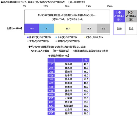 ガソリン車では暖房を使っても燃費に大きく影響しないことを知っていた人の割合を都道府県別にみると、1位は福島県(47.0%)、2位は群馬県と愛知県(いずれも46.0%)となりました。