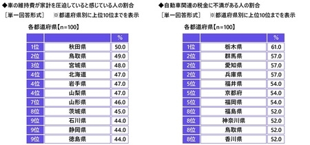 車の維持費が家計を圧迫していると感じている人の割合を都道府県別にみると、1位は秋田県(50.0%)、2位は鳥取県(49.0%)、3位は宮城県(48.0%)でした。