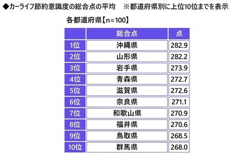 また、【自動車購入費の節約】【ガソリン代の節約】【ドライブ費用の節約】【車検・メンテナンス費用の節約】【自動車保険料の節約】の5項目の点数を合計した総合点(各項目100点満点の計500点満点)について、都道府県別に平均をみると、1位は沖縄県(282.9点)、2位は山形県(282.2点)、3位は岩手県(273.9点)、4位は青森県(272.7点)、5位は滋賀県(272.6点)でした。