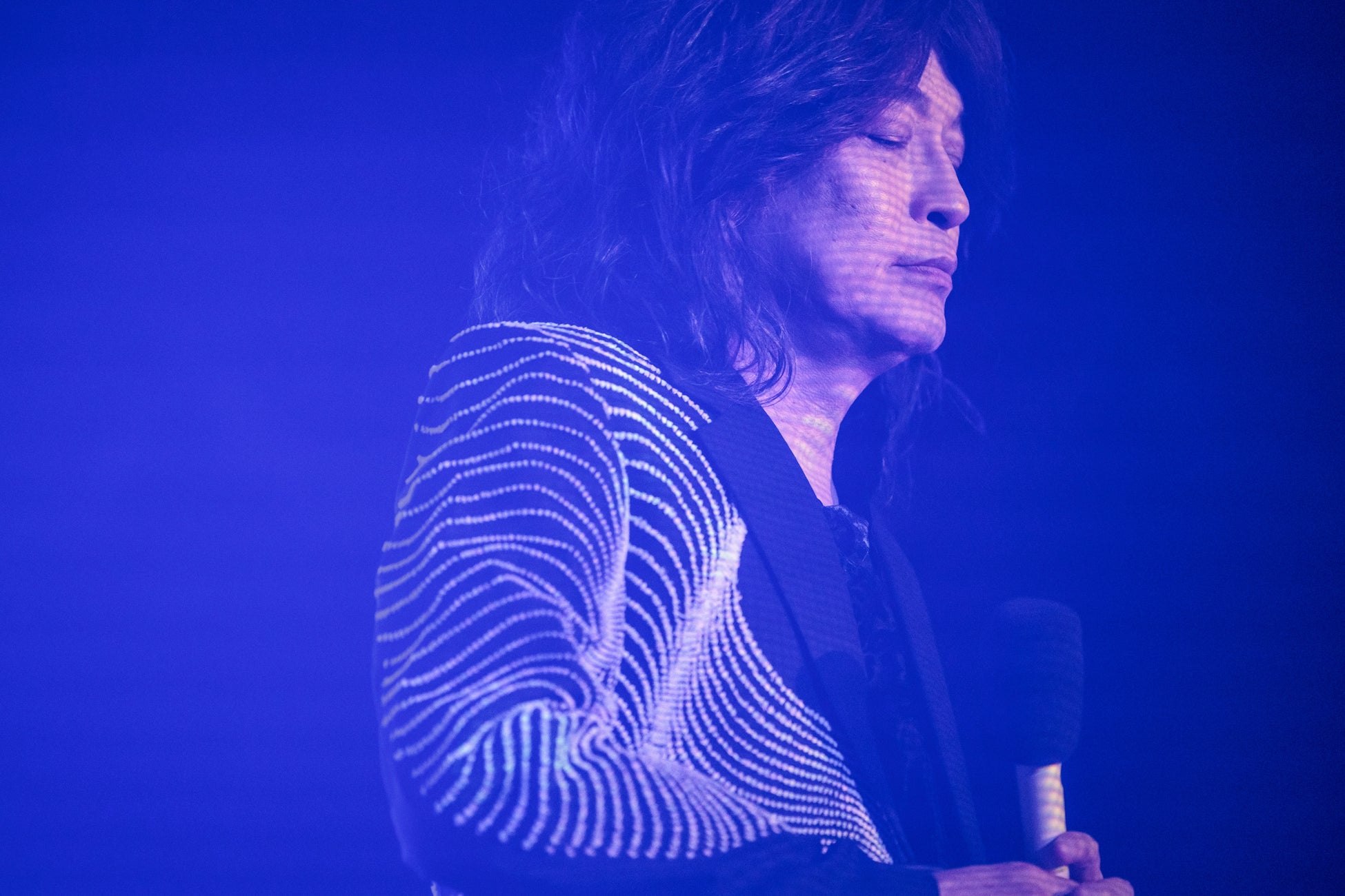 中島美嘉の「雪の華」やX JAPANの「ENDLESS RAIN」などのカヴァー動画が映写されるVJタイムを経て、紺のスーツに着替えた小野が華麗に再登場。ハードなギターリフが疾走する「最後のエゴイスト」、ファンキーなドラムが躍動する「Q~だけどなにか違うんだよ」といったアップ・チューンを準備して汗だくで会場を盛り上げていく。そしてここで問答無用の名曲「You’re the only…」が姿を現す。「代表曲があるのはありがたいこと」としみじみとした口調で語られてから歌われたこの名バラードだが、サプライズで用意されたブルーのサイリウムの灯がいくつも揺れるなか、年齢を重ねるごとにそういった感謝の念が強まっているという事実がひとフレーズごとに零れ落ちるのが見えてくる、そんなとてもエモーショナルなパフォーマンスだったとしっかり記しておきたい。その後もバラード・タイムは続き、センチメンタルなメロディーが映える「八月の夏」、切々とした情感に貫かれた「When love’s Gone」、そして大らかな世界観が広がる「FAITHFULLY」へと繋がっていく甘美なひとときを育みながら、本編が終了。