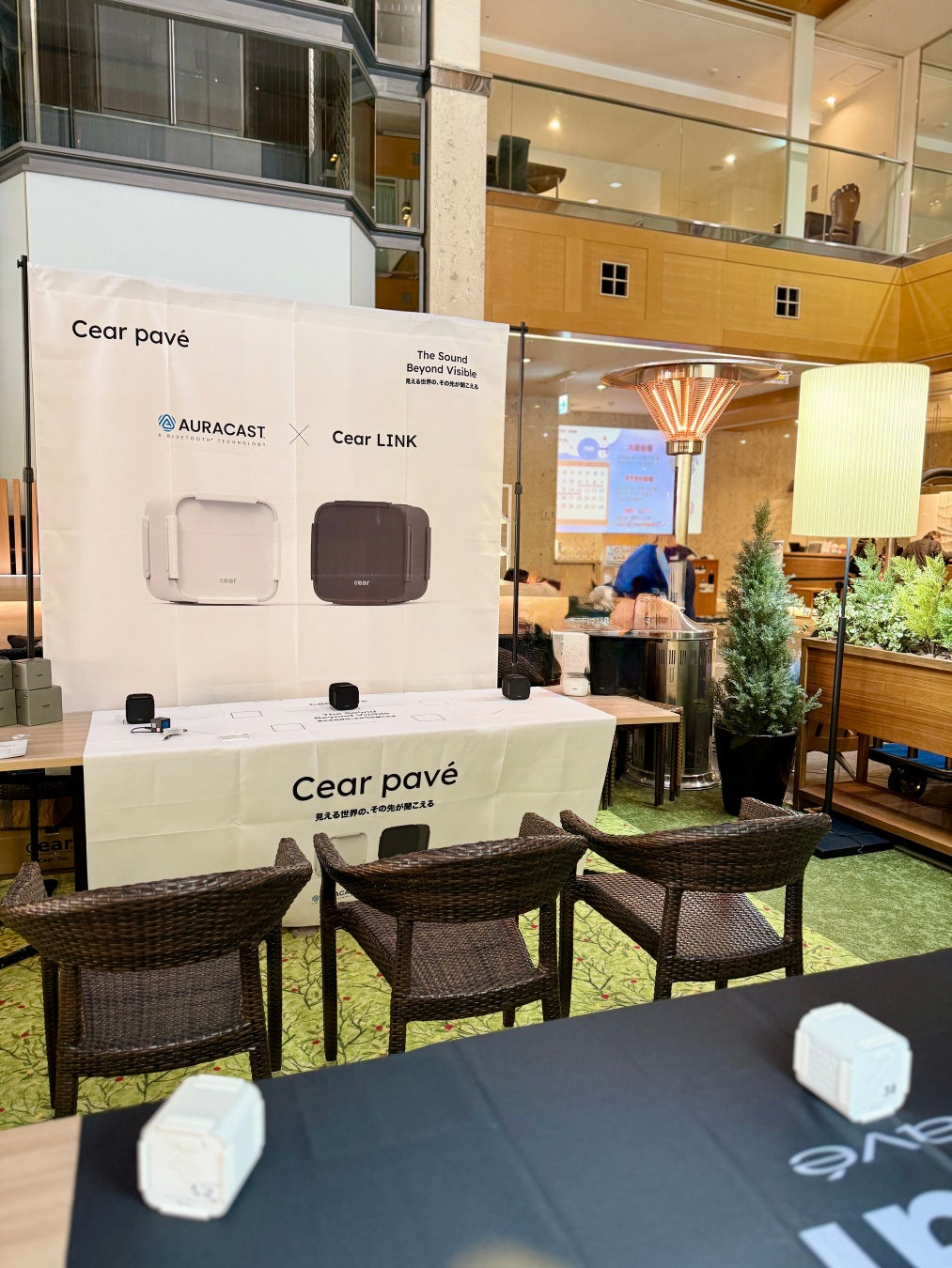 シーイヤーは本ラウンジにおいて、空間立体音響スピーカー「Cear pavé」18台を設置し、最新Bluetooth LE Audio Auracast™を活用した同期再生と、独自技術による空間立体音響演出を行っています。