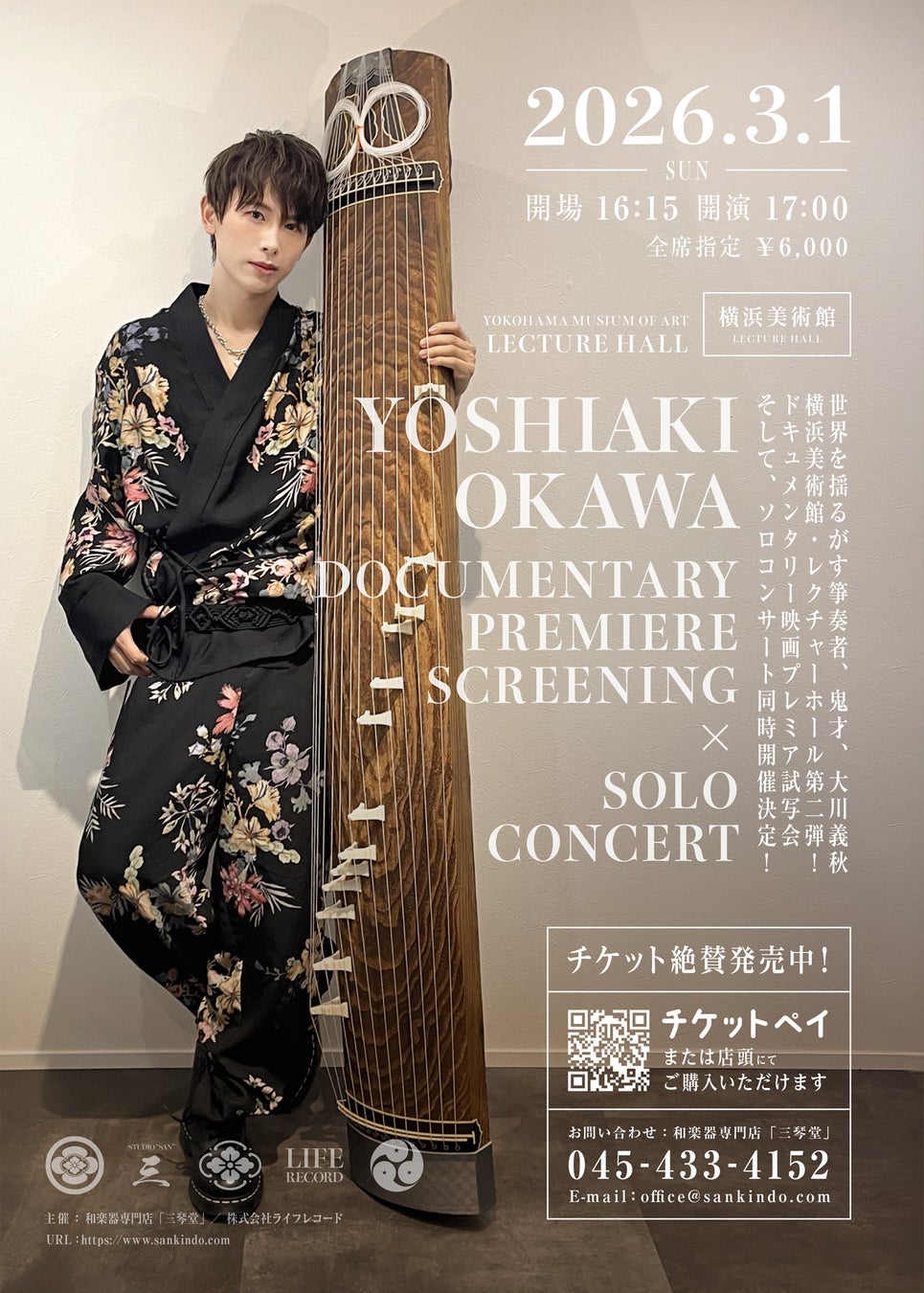 2026年3月1日箏奏者・大川義秋によるドキュメンタリー映画試写会・ソロコンサート同時開催決定!一般発売は2026年2月3日 (火) 18:00より開始します。是非ご参加ください!