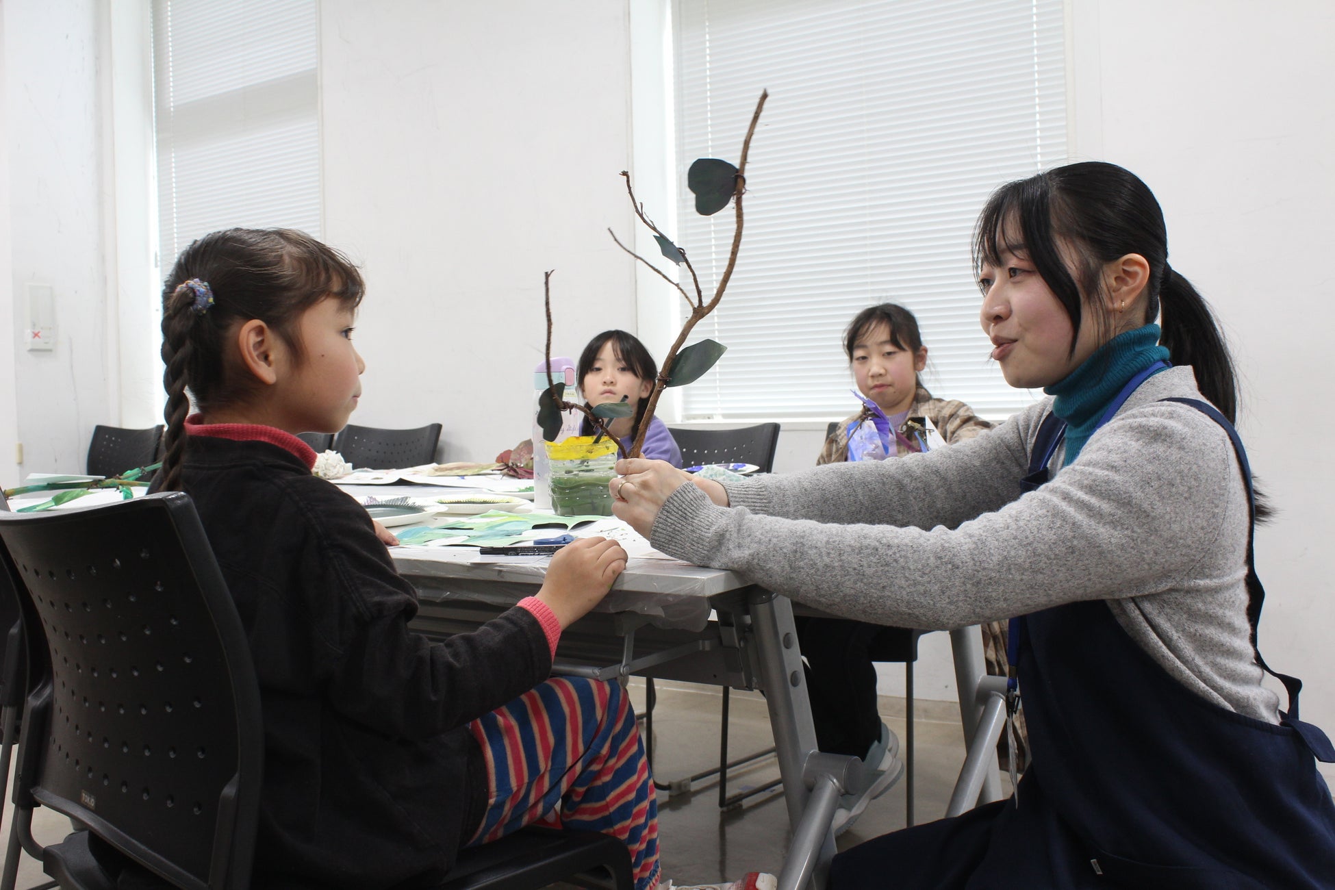 自然の中にあるたくさんの葉っぱを参考に、色について学びながら、えのぐを混ぜて、自分だけの色づくりにチャレンジしました。えのぐを画用紙にぬって葉っぱを作り、オリジナルの枝を作りました。展覧会では、みんなの枝が集まり一つの木になります。