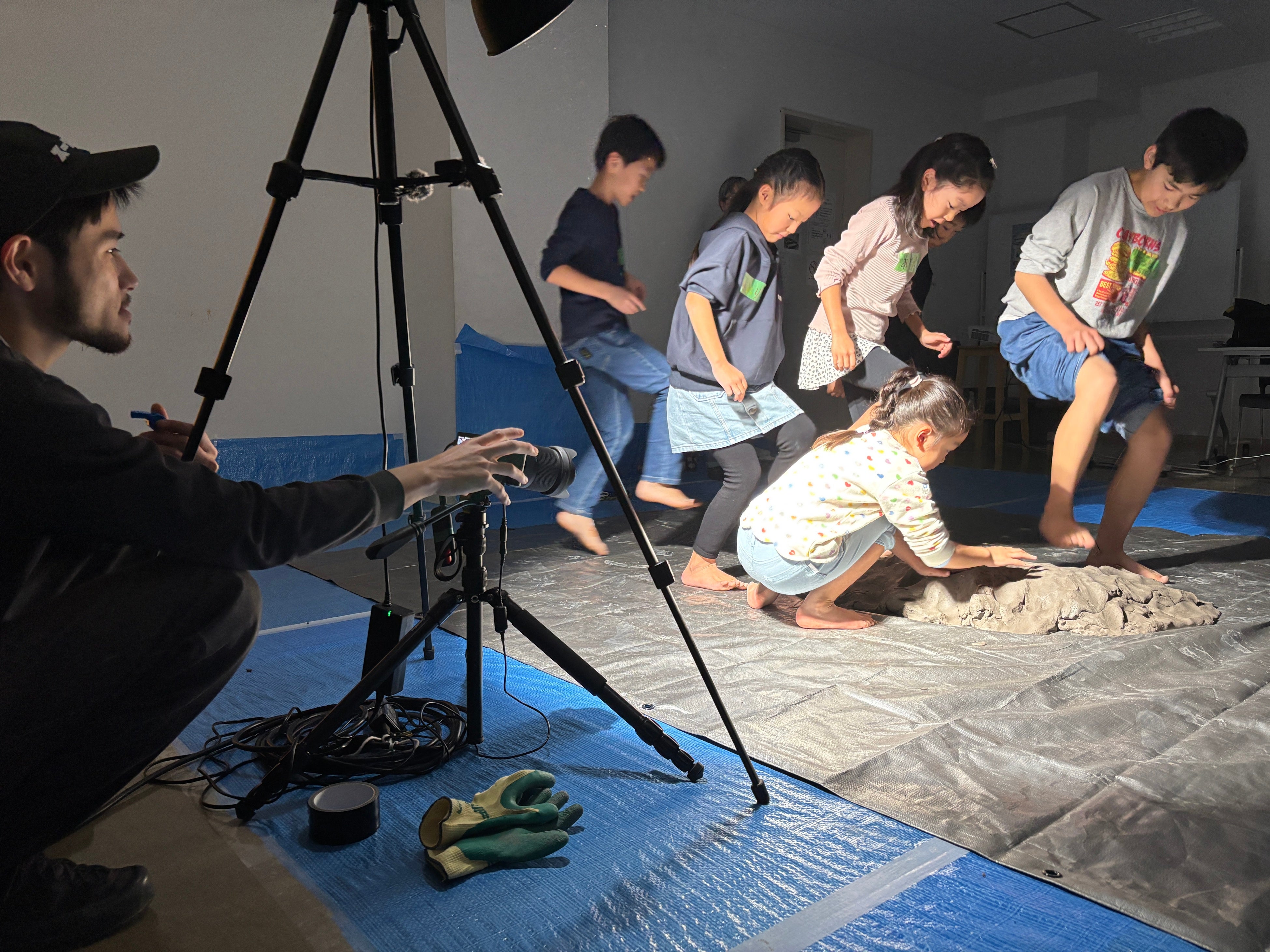 粘土を踏んだり、こねたり、のばしたり、みんなで相談しながら「まち」をつくっていきました。土地の風景が変わっていくように建物や道路が次々と現れ、変化していく粘土の町をカメラでコマ撮りし、映像作品にしました。