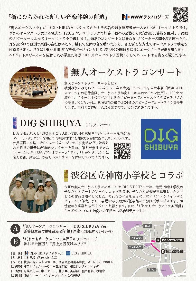 株式会社NHKテクノロジーズ(本社:東京都渋谷区)は、2026年2月13日(金)〜15日(日)に開催されるテクノロジーとアートのイベントDIG SHIBUYA 2026に出展し、体験型音楽展示「無人オーケストラコンサート in DIG SHIBUYA」を開催いたします。