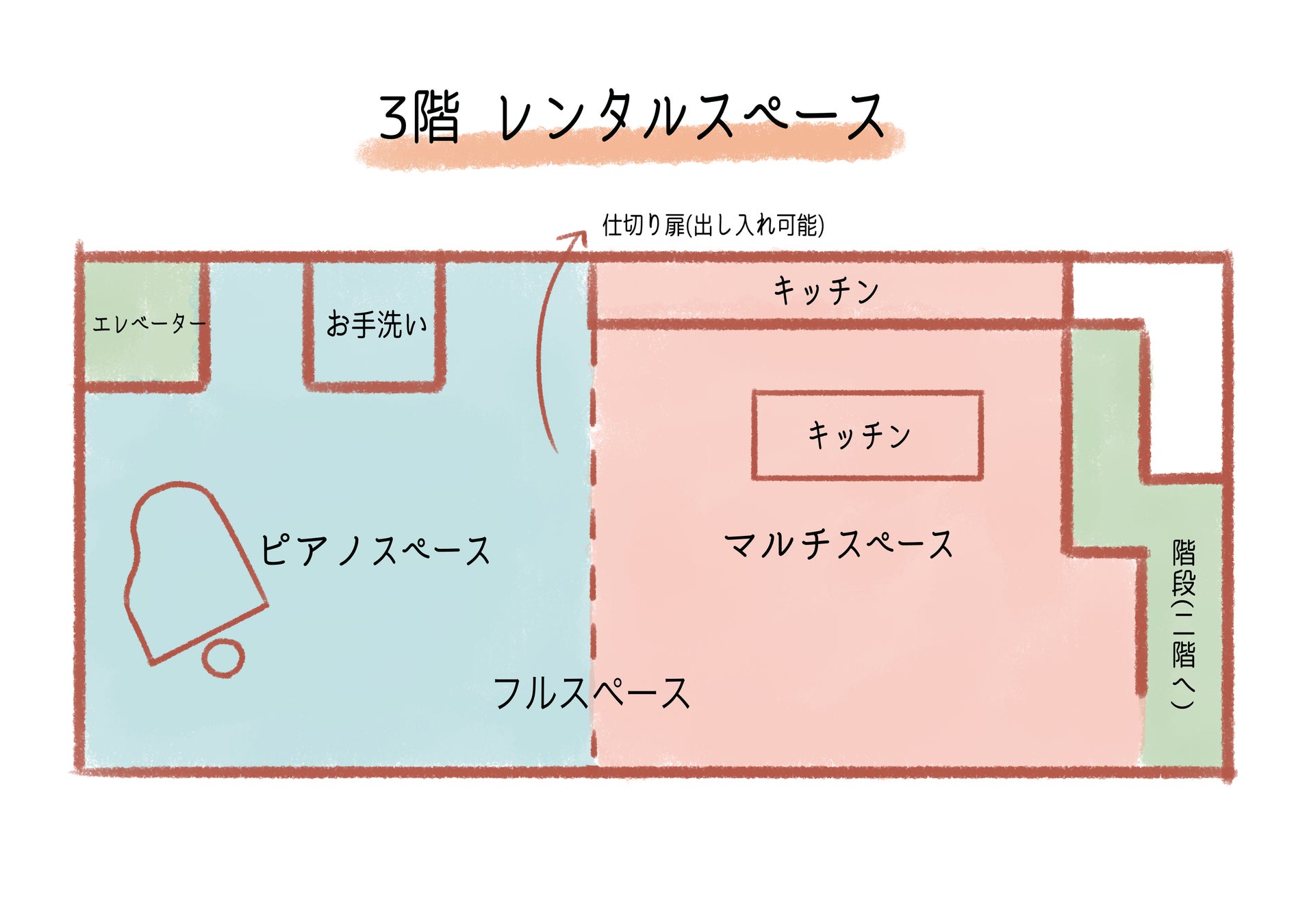 また、少人数向けの「ピアノスペース(定員約1〜10名)」に加え、キッチン付きのマルチスペース、イベント向けのフルスペース(最大35名)を備え、用途や人数に合わせて柔軟に使えることも特徴です。