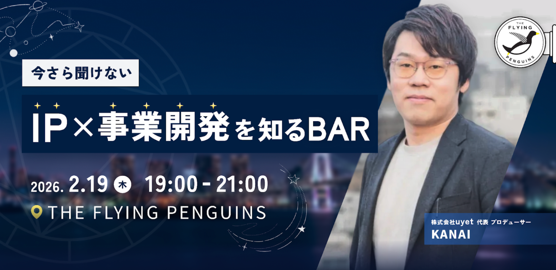 VTuber、IPコンテンツを通して日本と世界で新たな流通を生み出す“IPコンテンツの総合商社”株式会社uyet(ユエット)(本社:東京都渋谷区、代表取締役:梶田大樹)は、THE FLYING PENGUINS(通称:フラペン)と共同で2026年2月19日(木)19:00からイベント「今さら聞けない IP×事業開発を知るBAR」を開催します。