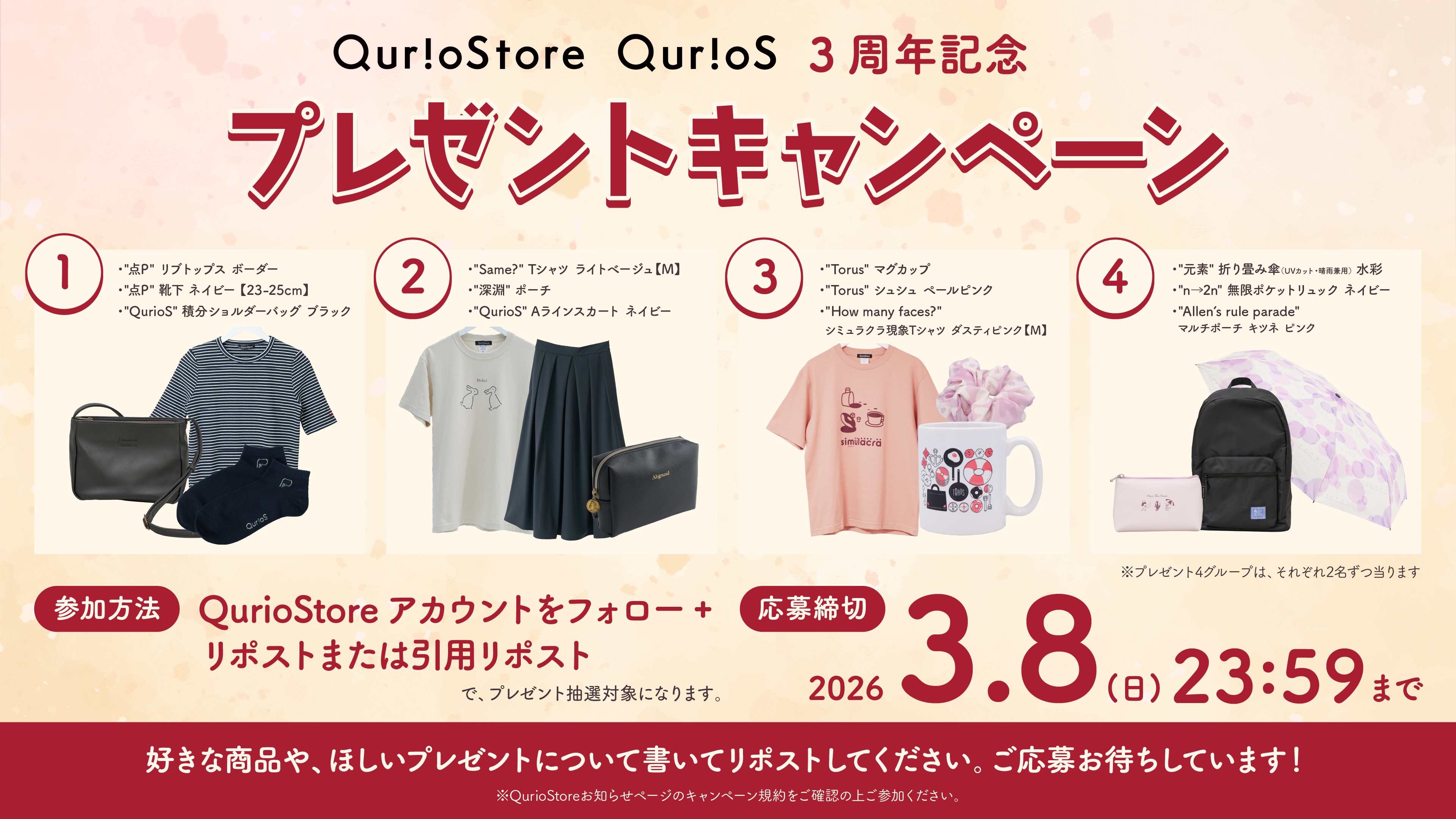 株式会社baton(東京都品川区、代表取締役 衣川洋佑)が運営する通販サイト「QurioStore(https://quriostore.com/ )」並びにオリジナルブランド「QurioS」は、2025年2月7日にオープン3周年を迎えました。これまでのご愛顧に感謝をこめて、人気アイテムが当たるXプレゼントキャンペーンや、限定デザインのマスキングテープがもらえる購入特典など、3周年を記念した特別企画を実施いたします。