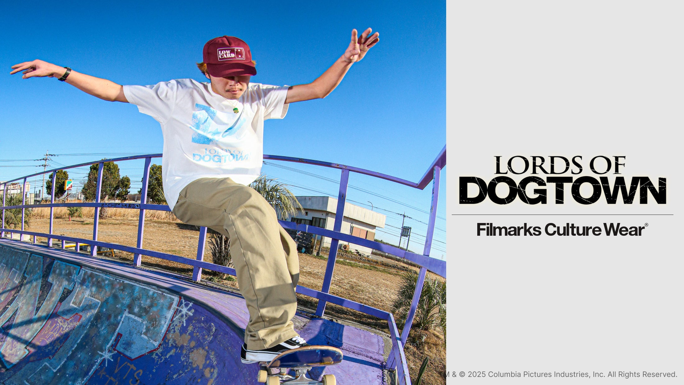 2005年12月10日に公開された『ロード・オブ・ドッグタウン』は、1970年代カリフォルニアの“Z-Boys”と呼ばれたスケートボードチームを描いた青春映画で、映画とスケートカルチャー双方のファンから長く愛され続けています。今回の20周年記念アイテムは、作品の象徴的なスチールカットやロゴをモチーフに、ストリートウェアとして日常使いしやすい2種類のデザインに落とし込みました。