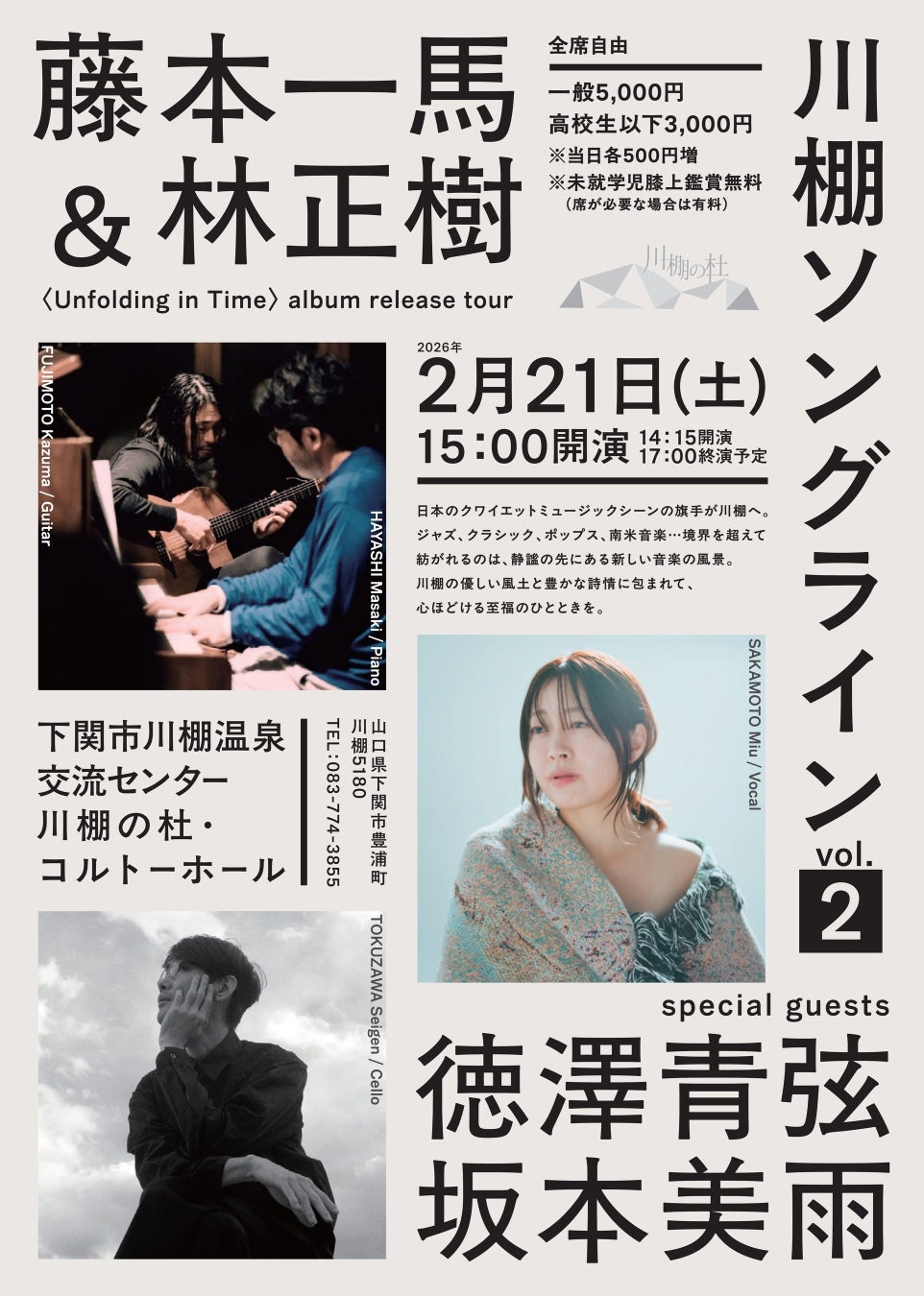 ![<川棚ソングライン vol.2> 藤本一馬[gt]&林正樹[pf]、徳澤青弦[vc]、坂本美雨[vo] が出演! 2026年2月21日(土)、川棚の杜・コルトーホール(山口県下関市)にて開催](https://entamerush.jp/wp-content/uploads/2026/02/2026-02-09_12-46-15_804098.jpeg)