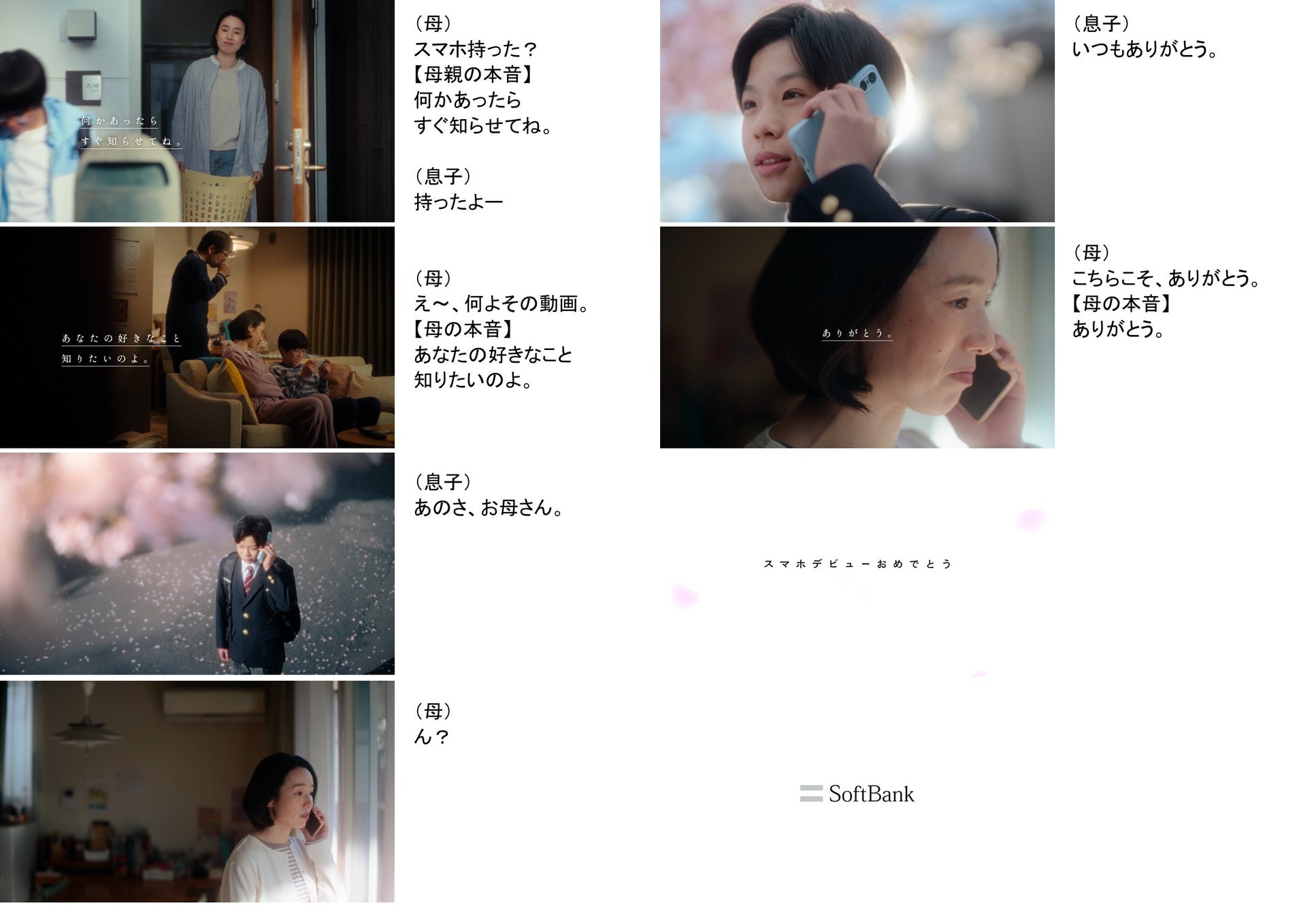 本作では、「ソフトバンクデビュー割」を提供するソフトバンクとして、自立へと向かう子どもの背中を押し、新しい形で親子の絆を深めていく様子を描き、「いつでも、いつまでも、家族をつなぐもの。」と、スマホがもたらす安心とつながりの価値を映し出した、全ての子育て世代に寄り添う物語になっています。