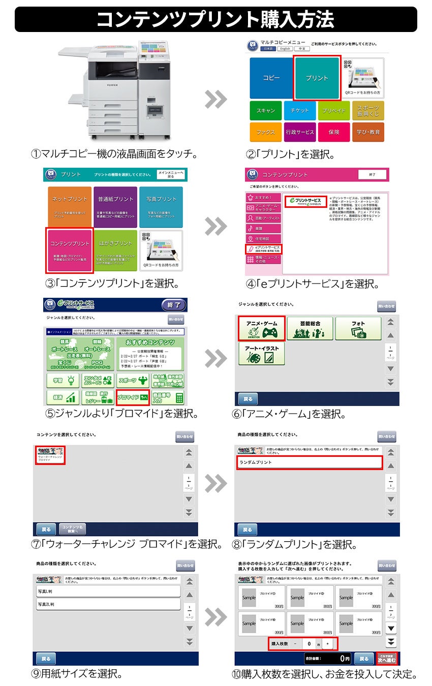 マルチコピー機から直接商品を選択して購入する方法と、eプリントサービスからQRコードを確認して購入する方法があります。