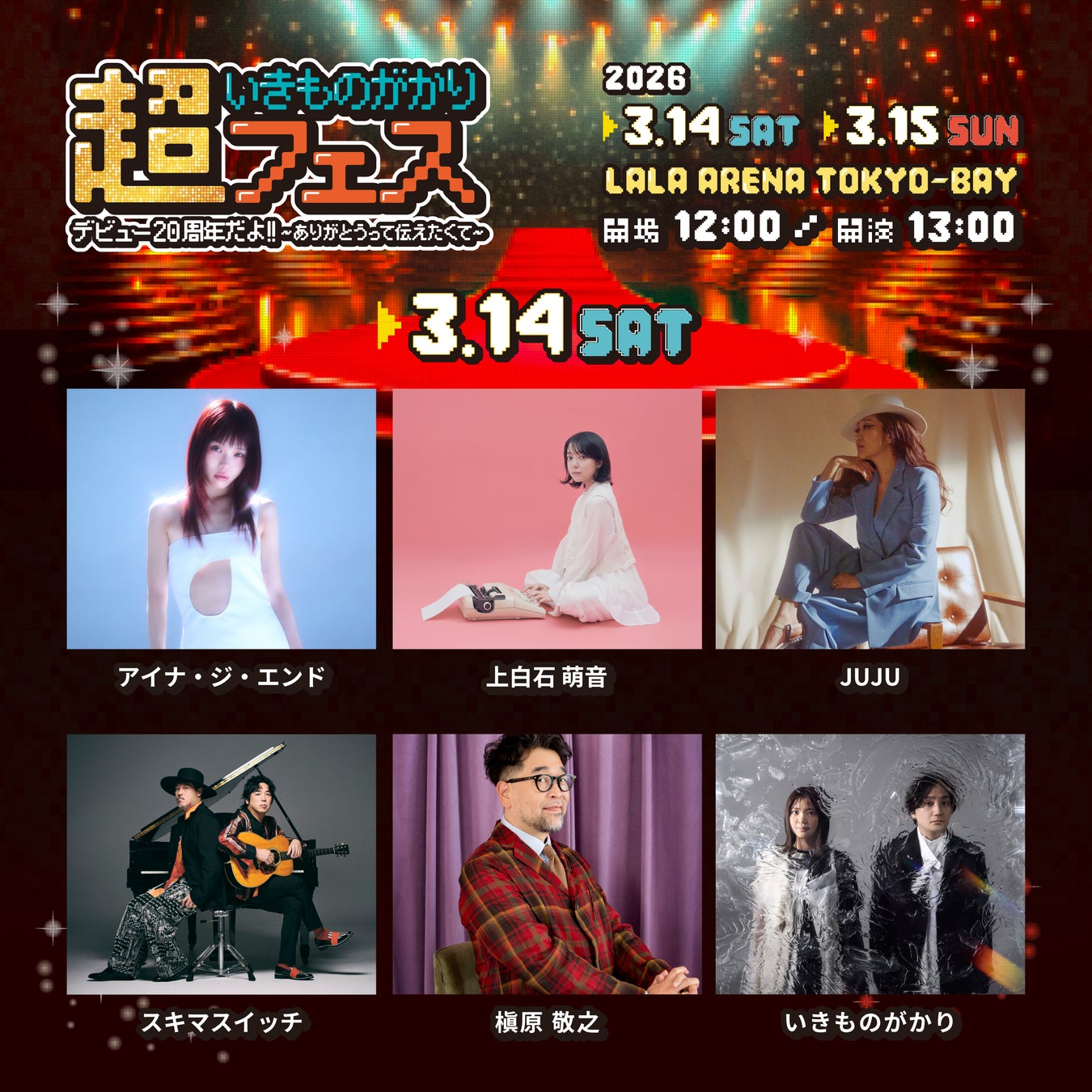 3月14日(土)、15日(日)にLaLa arena TOKYO-BAYにて開催する、いきものがかり自身初となる主催フェス 《超いきものがかりフェス デビュー20周年だよ!! 〜ありがとうって伝えたくて〜》 、15日(日)の公演に大先輩である”鈴木雅之”の出演が急遽決定しました!