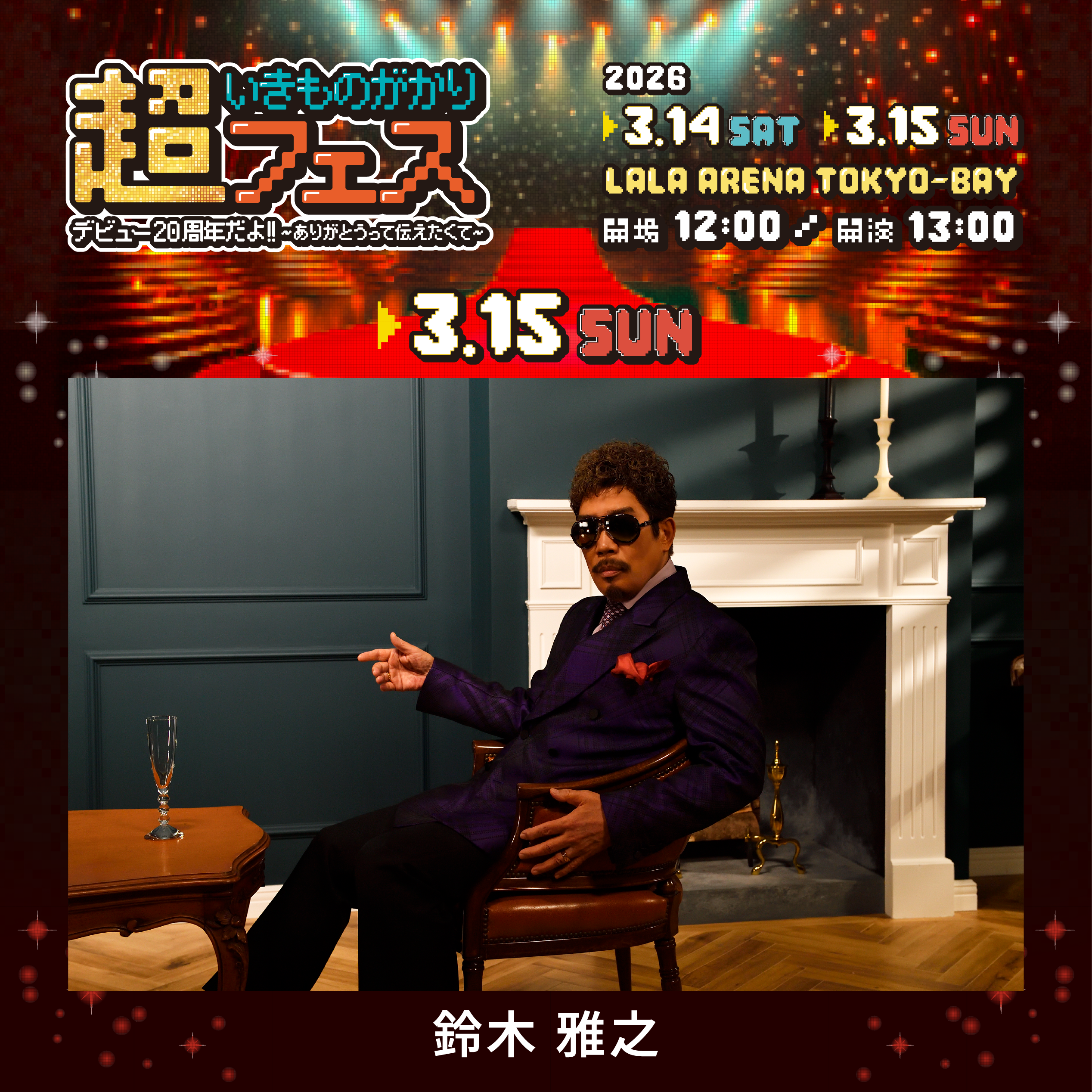 3月14日(土)、15日(日)にLaLa arena TOKYO-BAYにて開催する、いきものがかり自身初となる主催フェス 《超いきものがかりフェス デビュー20周年だよ!! 〜ありがとうって伝えたくて〜》 、15日(日)の公演に大先輩である”鈴木雅之”の出演が急遽決定しました!