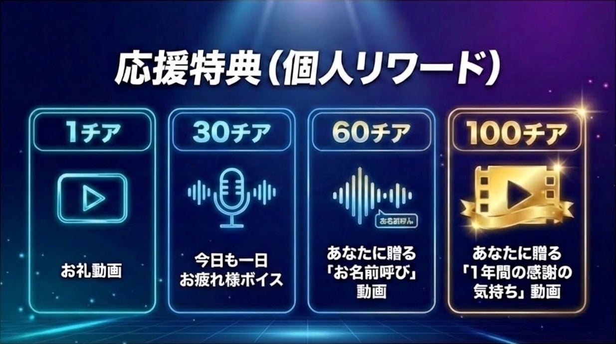 イベント期間中に獲得した累計のチア(応援数)に応じて、候補者本人からのデジタル特典をプレゼントいたします。