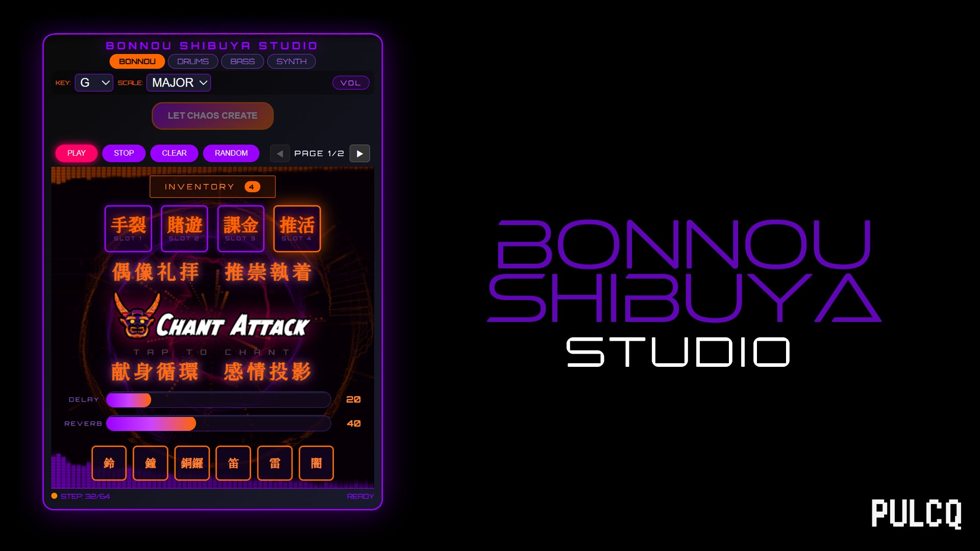 本作品は、PULCQで展開中のゲーミングシンセ 「BONNOU SHIBUYA STUDIO」を用いた、ユーザー参加型のゲーム/作曲体験作品です。
