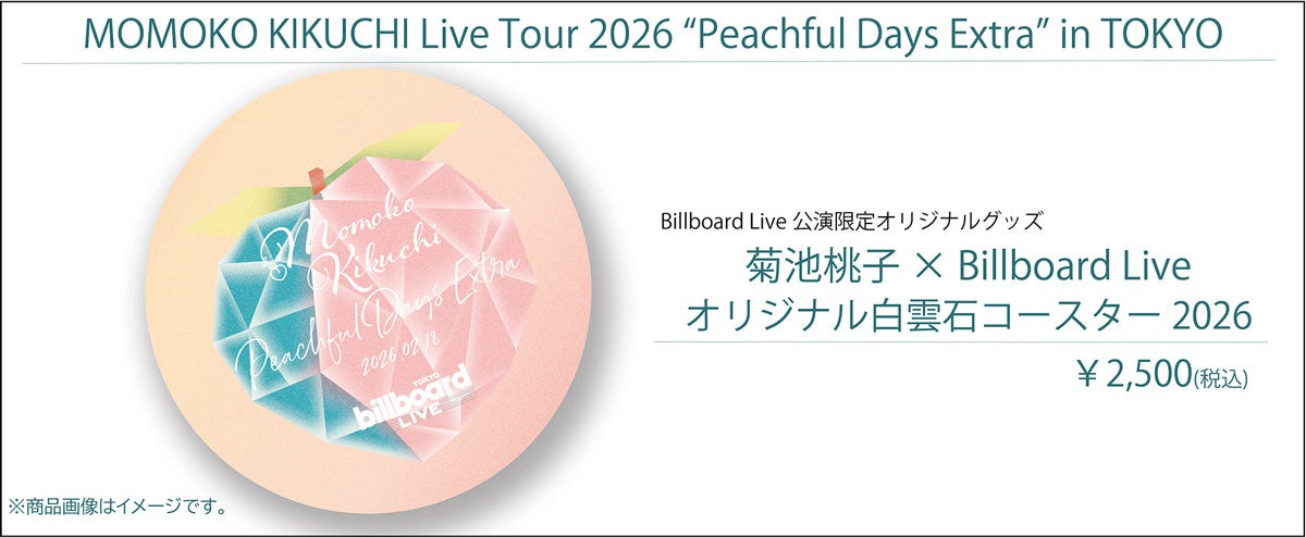 株式会社阪神コンテンツリンクでは、菊池桃子の3年連続となるビルボードライブでのソロ公演を記念して、限定オリジナルグッズをオンラインショップ【Shop.Merchan.jp(ショップ・マーチャンドットジェイピー)】にて、2026年2月13日(金)12:00より販売いたします。一昨年、昨年と大好評を博した「オリジナル白雲石コースター」、今回も“桃”をモチーフにした可愛らしいデザイン仕様となっています。ぜひこの機会にお買い求めください。