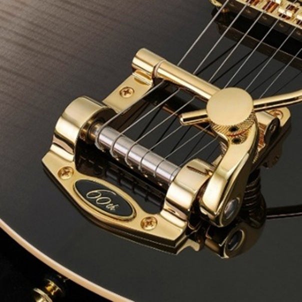 外観は、フレイムメイプルトップに加え、洗練されたノーベルブラック仕上げを採用。ヘッドストックとトレモロユニットには記念ロゴが刻印され、ヘッド裏には「Made in Japan」と60周年記念の判子が施されています。