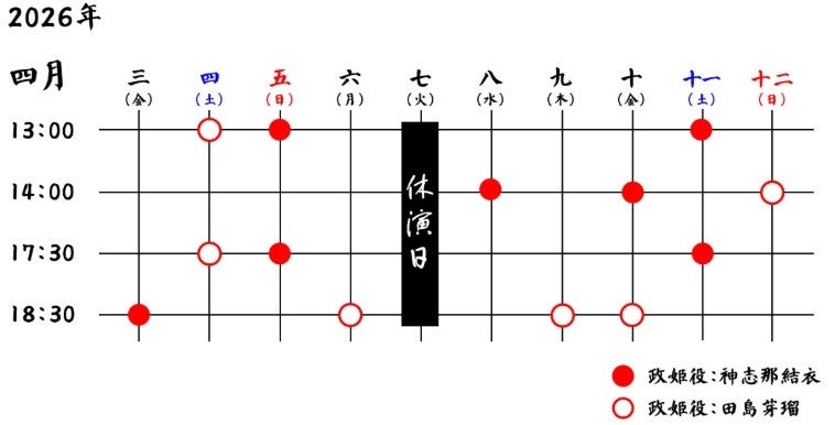 ※●印の公演は政姫役:神志那結衣、◯印の公演は政姫役:田島芽瑠となります