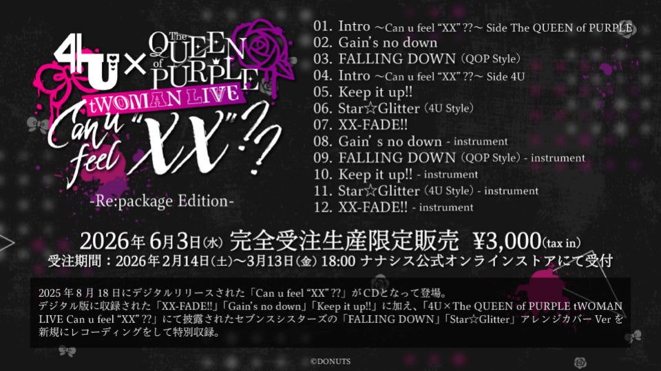 2025年8月に開催された4U、The QUEEN of PURPLEの対バンライブ「4U×The QUEEN of PURPLE tWOMAN LIVE Can u feel XX??」で披露された新曲「Gain’s no down」、「XX-FADE!!」、「Keep it up!!」、およびカバー楽曲「FALLING DOWN」、「Star☆Glitter」を収録したCDの発売が決定!現在ナナシスオフィシャルストアにて予約受付中です。