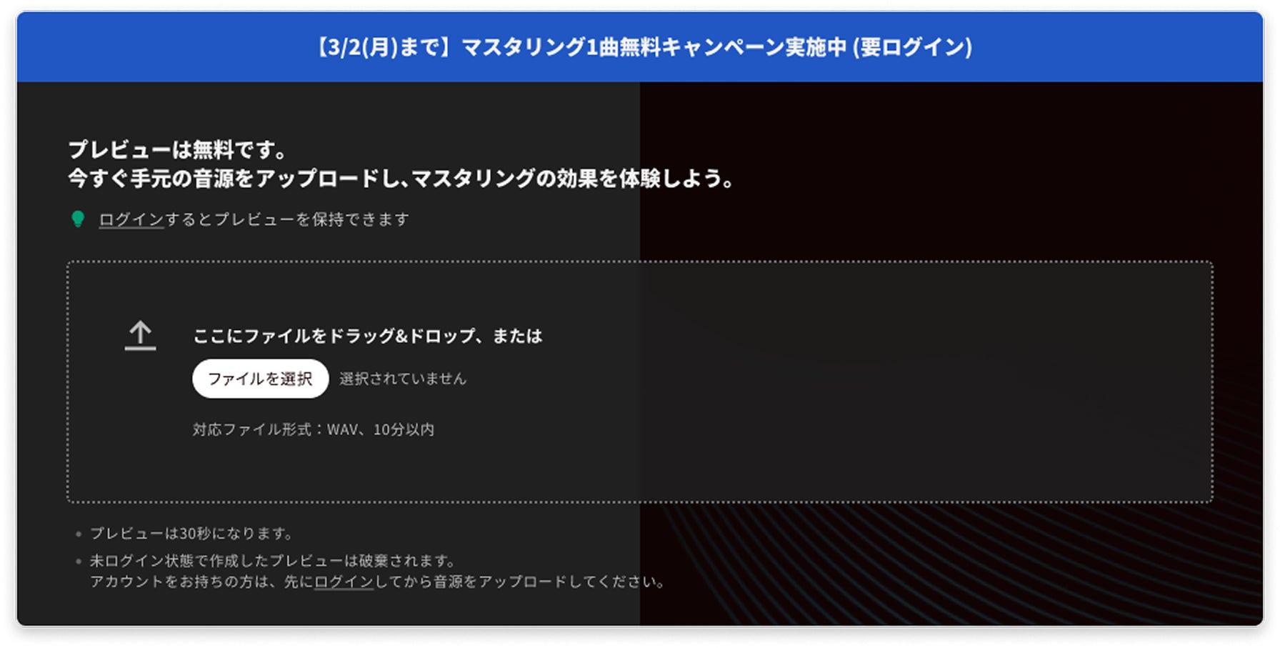 本キャンペーンでは、通常有料で提供されるマスタリングサービス(1曲 660 円(税込))を無料でご利用いただけます。キャンペーン期間:2026年2月16日〜2026年3月2日