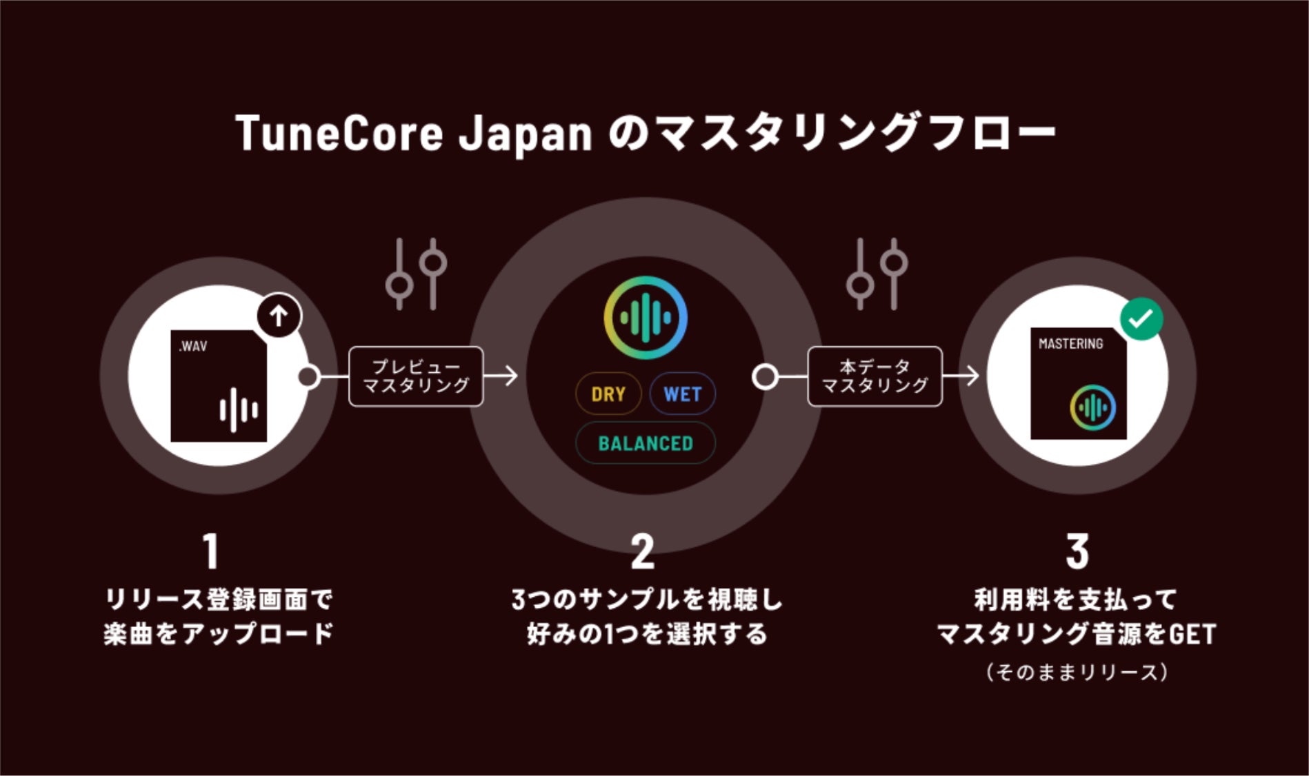 TuneCore Japan が提供する「マスタリングサービス」は、SOUNDRAW が開発した AI マスタリング技術を活用したオンラインサービスです。専門的な知識や機材を必要とせず、音源をアップロードするだけで数分以内に高品質なマスタリング音源を生成します。