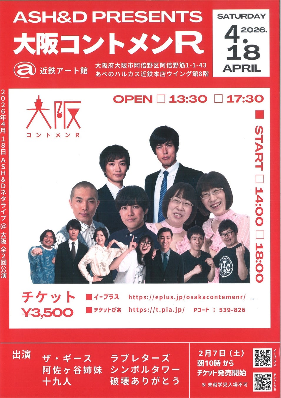 あべのハルカス近鉄本店(大阪市阿倍野区阿倍野筋1-1-43)にある劇場、近鉄アート館にて、4月、5月と2か月連続での東京お笑い事務所ライブを開催します。 この企画は「近鉄アート館 演芸ウィーク2026」の一環として開催されます。 4月18日(土)は阿佐ヶ谷姉妹が所属する事務所「ASH&D」、5月8日(金)はナイツが所属する事務所「マセキ芸能社」 の事務所ライブの開催となります。関西では開催の少ない、東京のお笑い事務所ライブです。