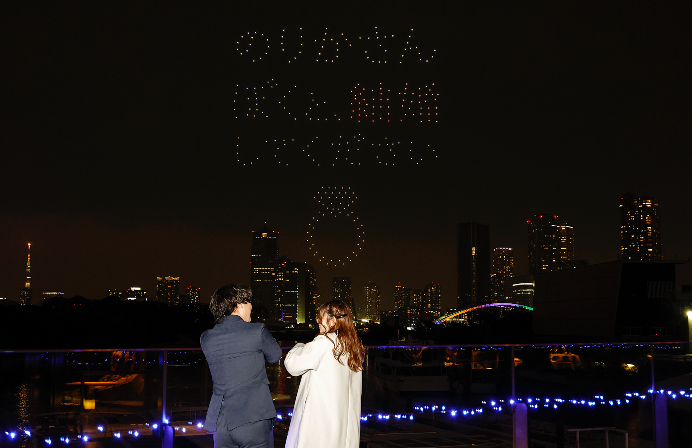 2月14日18:00。多くの人で賑わうウォーターズ竹芝の上空に300機のドローンが飛び立った。集まった一人ひとりのためのショーでありながら、この夜はLIGHTDANCeに特別な願いを託す人がいた。