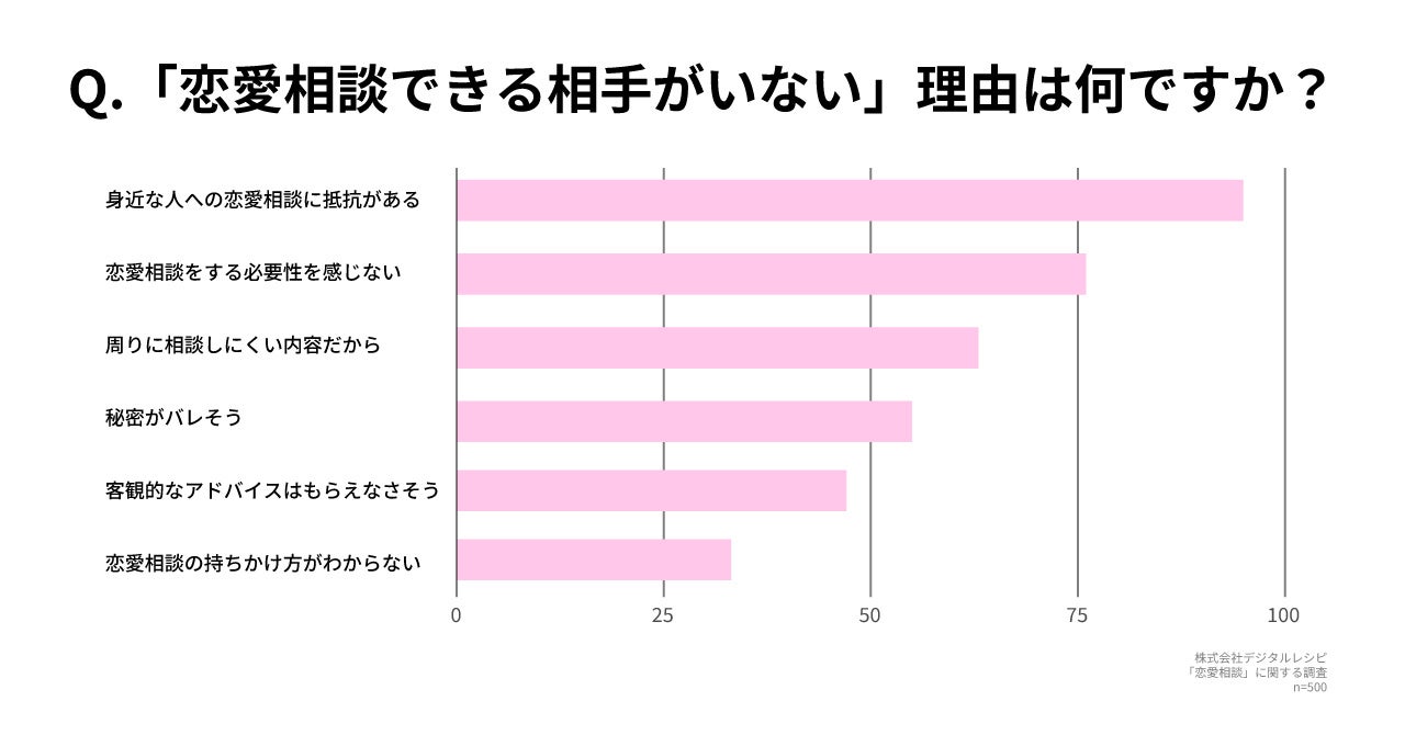 株式会社デジタルレシピが男女500名に行ったアンケート調査によると、「恋愛相談をできる相手がいない」が約半数、特に若い世代では「誰にも相談しない」と答える人が4割超であり、恋の悩みを一人で抱え込む傾向が顕著です。最大の理由は、「身近な人への恋愛相談に抵抗がある」が挙げられます。その中で今必要なのは、SNSなどに流れる“理想的な恋愛”よりも、利害関係がなく、評価もジャッジもない“ただ聞いてくれる存在”として安心して話せる「第三者としての相談相手」だと考えます。