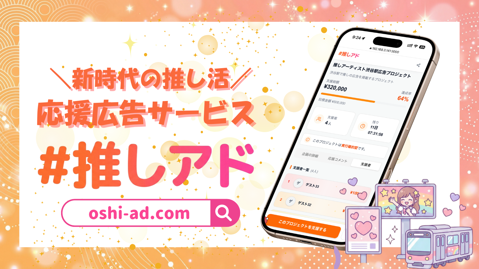 「#推しアド」は、K-POP、VTuber、アーティストなど、あらゆるジャンルの「推し」を持つファンが、少額から応援広告の出稿に参加できるクラウドファンディング型サービスです。