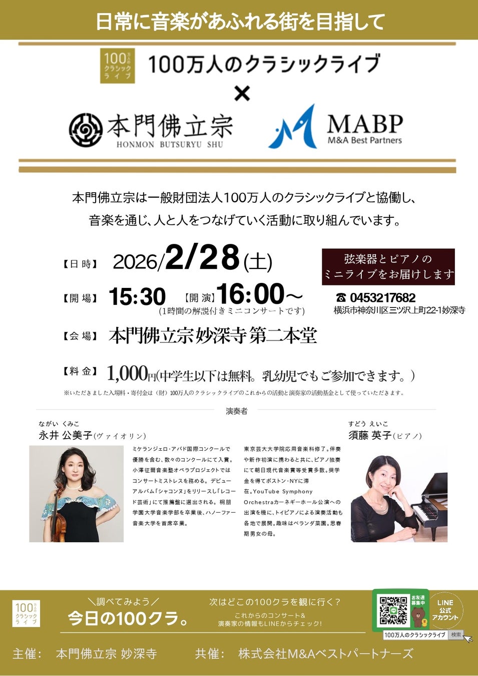 製造、建設、不動産、医療・ヘルスケア、物流、ITに特化したM&A仲介を⾏う株式会社M&Aベストパートナーズ(本社:東京都千代田区、代表取締役社長:齋藤 達雄 以下M&Aベストパートナーズ)と、一般財団法人100万人のクラシックライブ(東京都千代田区、代表理事:蓑田秀策 以下100万人のクラシックライブ)は、2月28日(土)16:00より、本門佛立宗 妙深寺にて、クラシックライブを開催することをお知らせいたします。