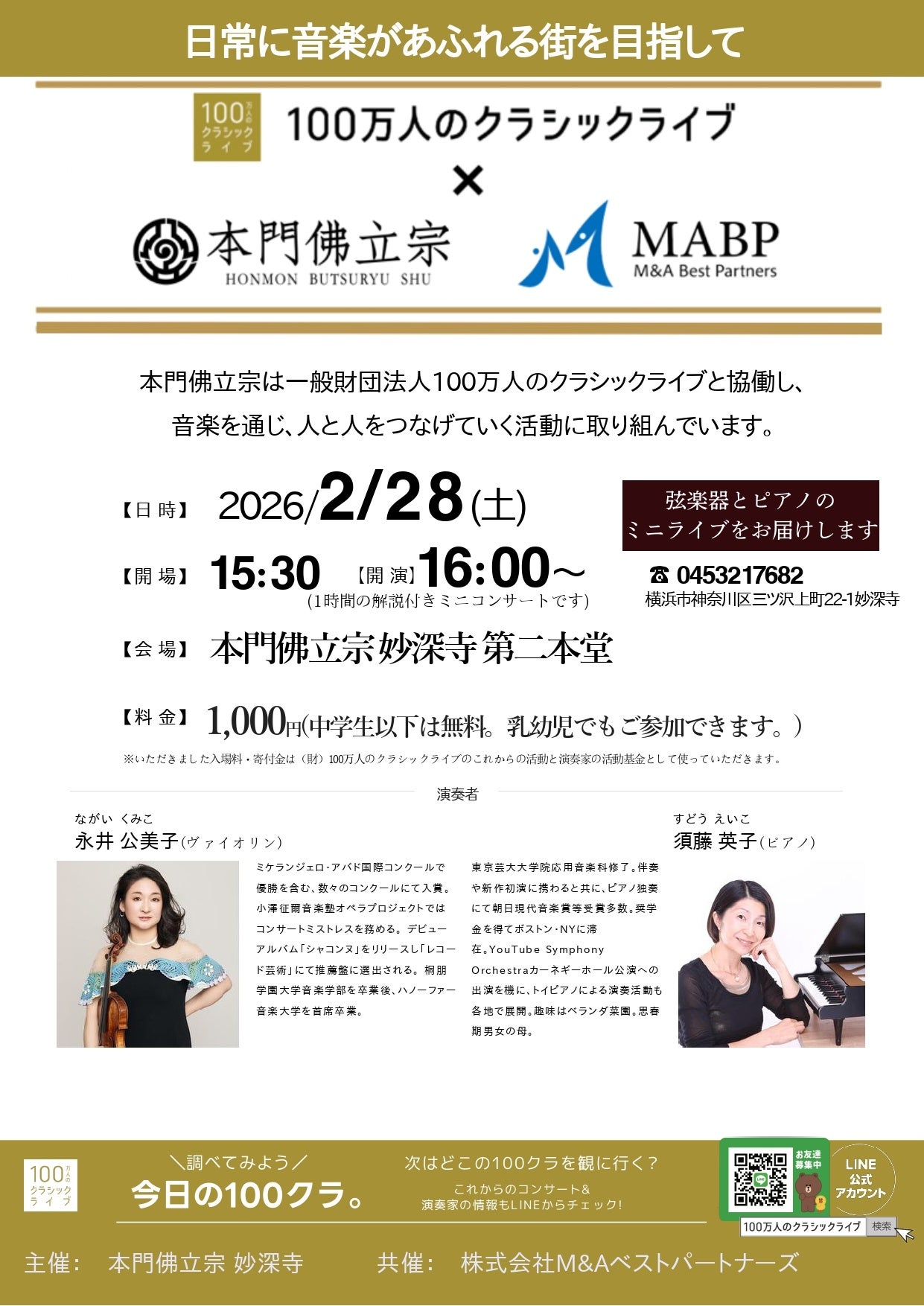製造、建設、不動産、医療・ヘルスケア、物流、ITに特化したM&A仲介を⾏う株式会社M&Aベストパートナーズ(本社:東京都千代田区、代表取締役社長:齋藤 達雄 以下M&Aベストパートナーズ)と、一般財団法人100万人のクラシックライブ(東京都千代田区、代表理事:蓑田秀策 以下100万人のクラシックライブ)は、2月28日(土)16:00より、本門佛立宗 妙深寺にて、クラシックライブを開催することをお知らせいたします。