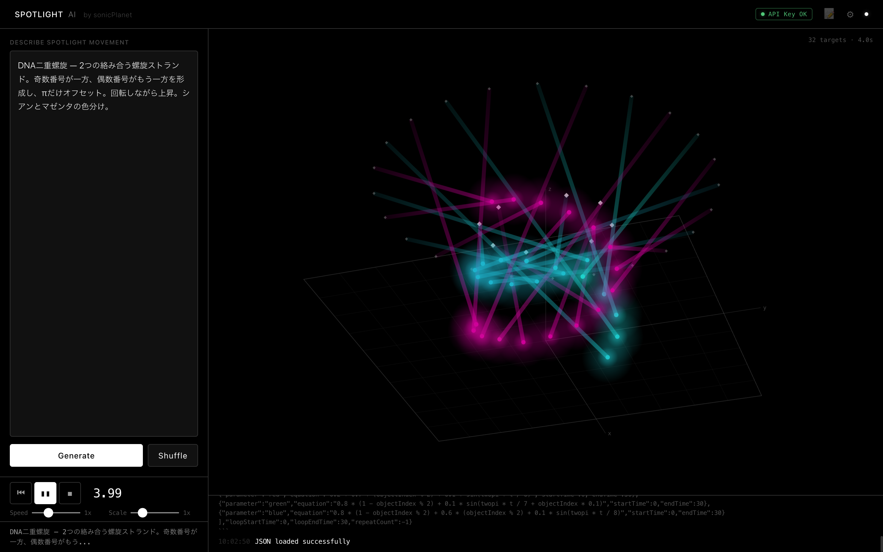 ユーザーの自然言語入力をAnthropic社の大規模言語モデル「Claude」に送信すると、AIは照明制御のための数学的関数群をJSON形式で返します。各スポットライトの位置座標(x, y, z)と色(R, G, B)を、時間tとオブジェクト番号を変数とする「数式」として表現するのです。