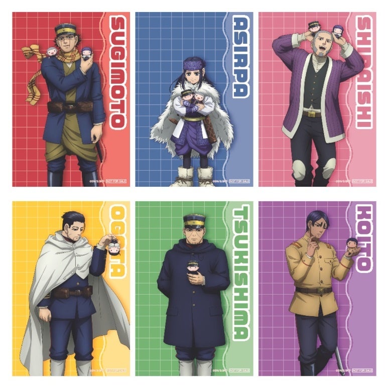 今回新たに描き下ろしたイラストを使用した「TOPPA!!! BASE AKIBA」オリジナルのぬいぐるみです。作品内に登場するキャラクター「杉元佐一」「アシㇼパ」「白石由竹」「尾形百之助」「月島軍曹」「鯉登少尉」をモチーフに、点々とした可愛らしい瞳が特徴のぬいぐるみです。手のひらサイズでボールチェーンがついています。