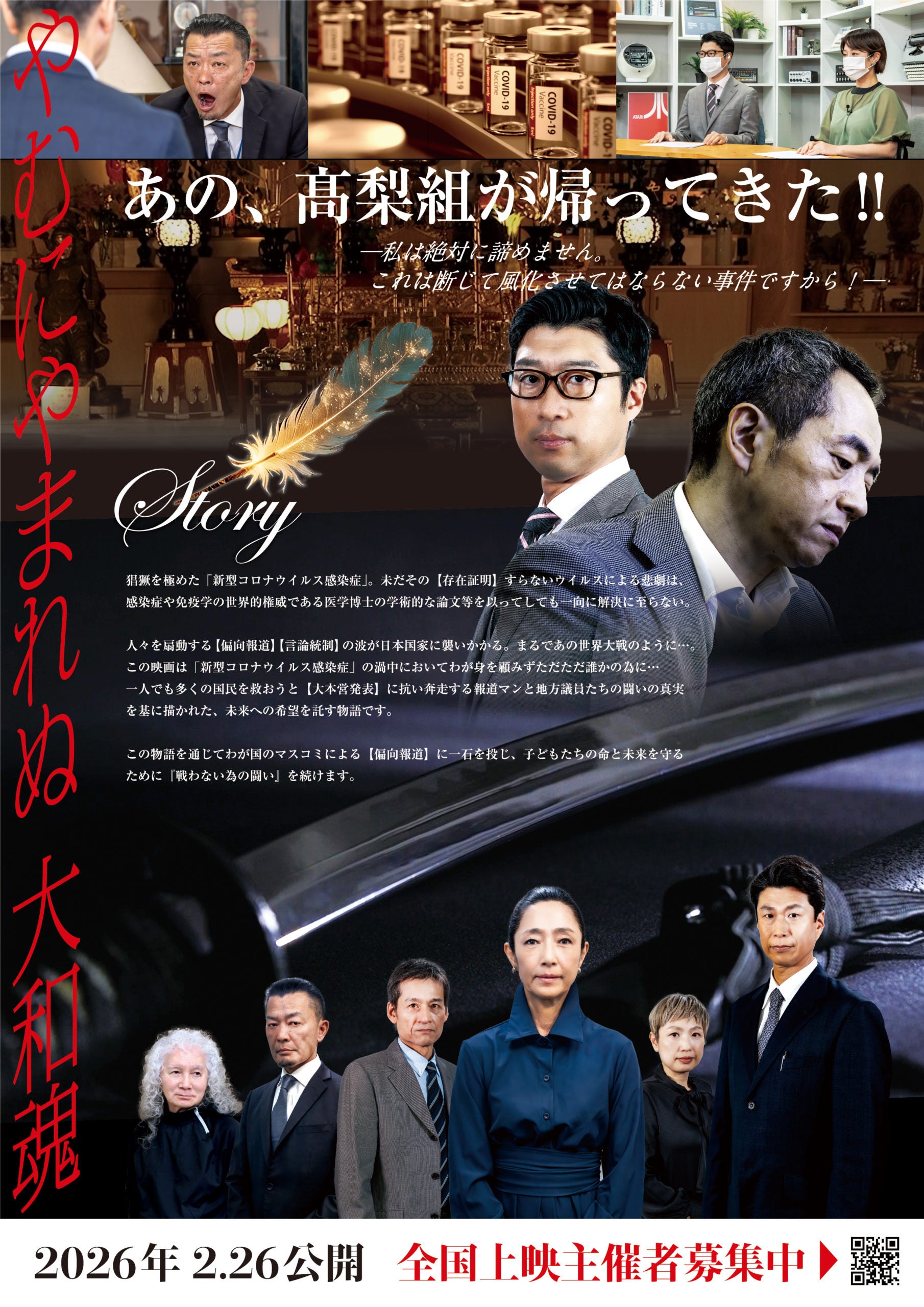【ストーリー】 猖獗を極めた「新型コロナウイルス感染症」。 未だその【存在証明】すらないウイルスによる悲劇は、 感染症や免疫学の世界的権威である医学博士の学術的な論文等を以ってしても一向に解決に至らない。 人々を扇動する【偏向報道】【言論統制】の波が日本国家に襲いかかる。 まるであの世界大戦のように…。 この映画は「新型コロナウイルス感染症」の渦中においてわが身を顧みずただただ誰かの為に… 一人でも多くの国民を救おうと【大本営発表】に抗い奔走する報道マンと 地方議員たちの闘いの真実を基に描かれた、未来への希望を託す物語です。 この物語を通じてわが国のマスコミによる【偏向報道】に一石を投じ、 子どもたちの命と未来を守るために『戦わない為の闘い』を続けます。 全ては子どもたちの命と日本の未来の為に。