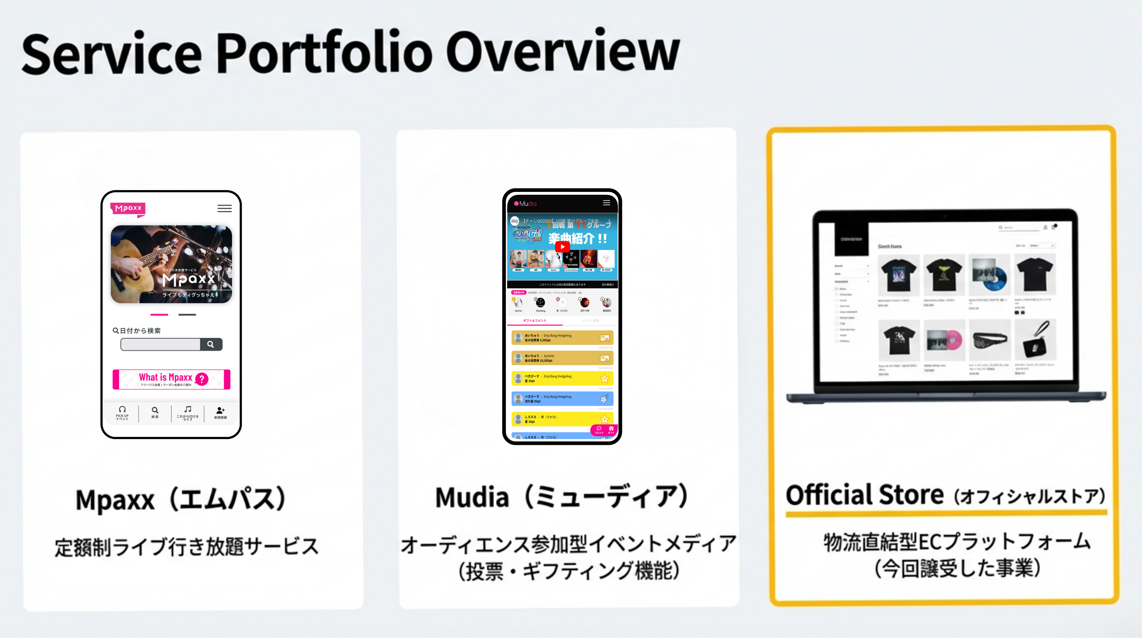 ソナーユーは、定額制ライブ行き放題サービス「Mpaxx(エムパス)や、オーディエンス参加型イベントメディアMudia(ミューディア)を通じて構築している「リアルなライブを愛するファンコミュニティ」を、今回譲受したEC事業と連携させます。これにより、単なるツールの提供に留まらず、プラットフォームが能動的にファンとの接点を創出する「成長支援型(伴走型)EC」を展開していきます。